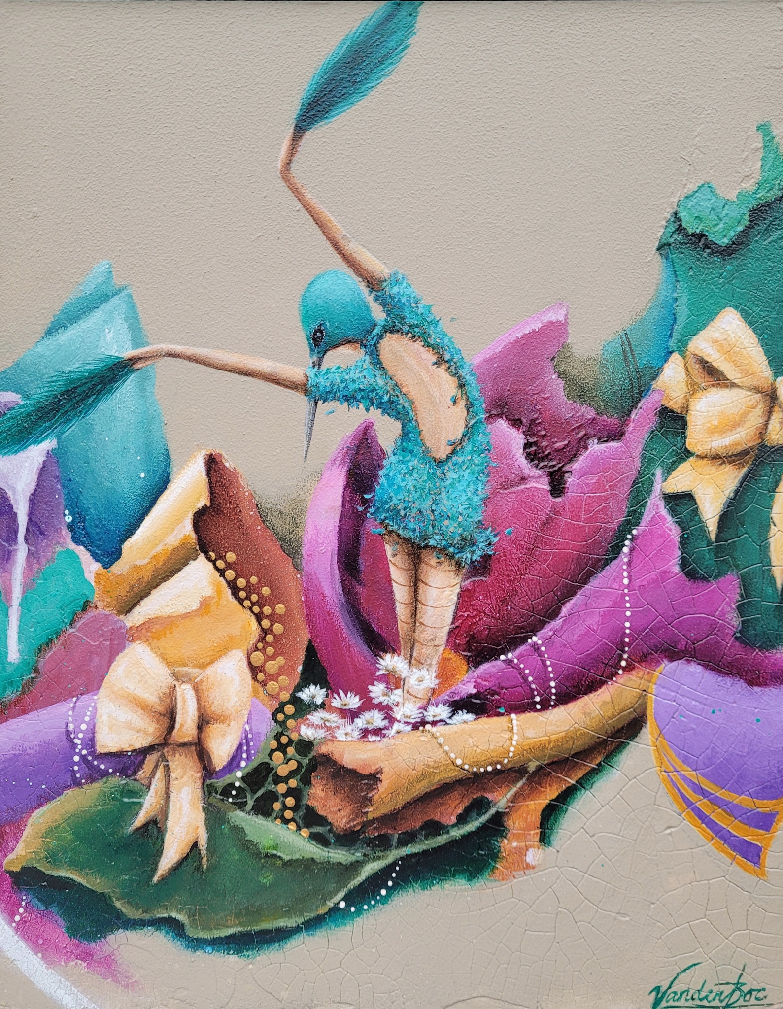 SOLD 'Little Treasure' van een vogelvrouw, kolibrie, tussen kleurrijke bloemen. afm. 30 x 24 cm. Alle Little Treasures zijn geschilderd op paneel en zijn ingelijst in een handgeschilderde houten baklijst die qua kleur afgestemd is op het schilderij.