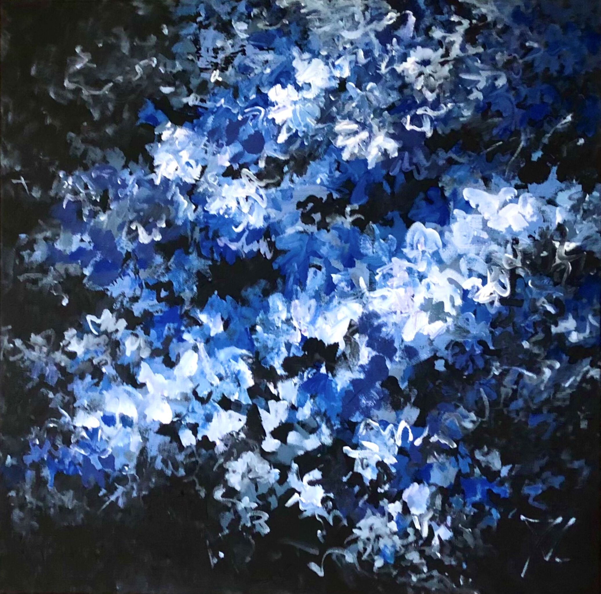 'Flourish' is een abstract bloemenschilderij – acryl op doek in diverse blauwtinten en bijna fluorescerend wit, intuïtief geschilderd met ritmische penseelstreken, gelaagde structuur en licht-donker contrast. Een modern abstract schilderij dat tot de verbeelding spreekt, dat rust brengt én blijft intrigeren, telkens als je ernaar kijkt. Over het werk: gesigneerd · acryl op canvas · opgespannen op stevig frame · meegeschilderde zijkanten · 4 cm dik doek · klaar om op te hangen Bij vragen neem gerust contact met mij op →