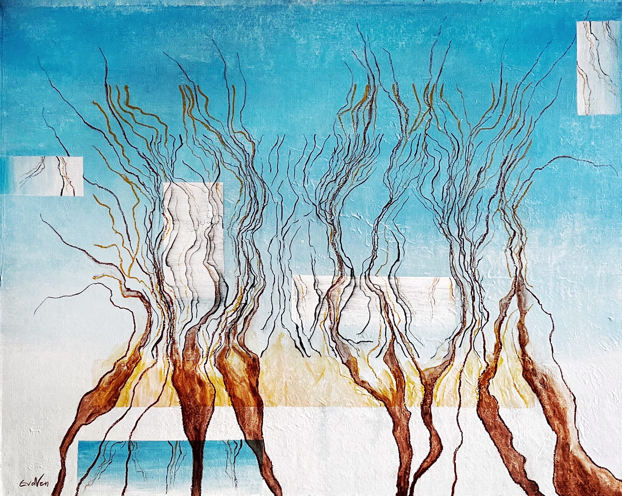 Schilderijen als wandelingen in een fictief landschap: natuurelementen die op elkaar inspelen, al dan niet met menselijke ingrepen.