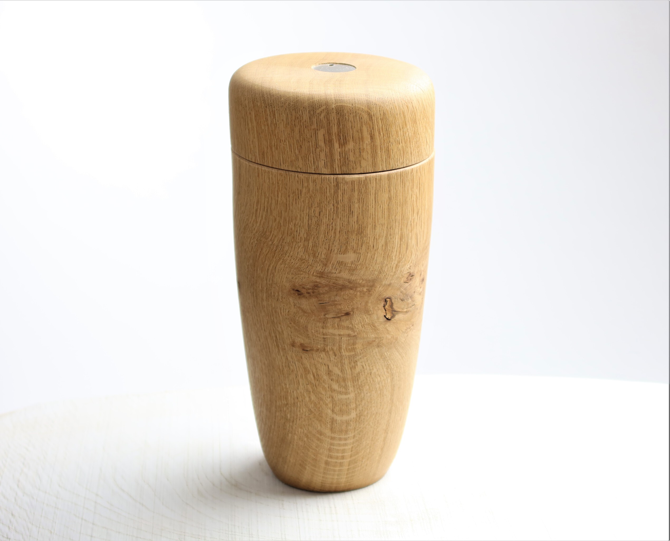 Urn voor een viervoeter. Gemaakt uit hout van monumentale eik. hoogte x diameter 300mm x 150mm.