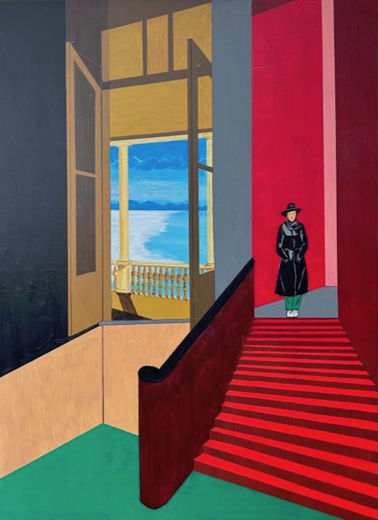 Ik schilder met acryl op doek met soms architectonische achtergronden. Met de menselijke figuren die ik erin aanbreng (geschilderd of als collage) probeer ik een verhaal te vertellen.