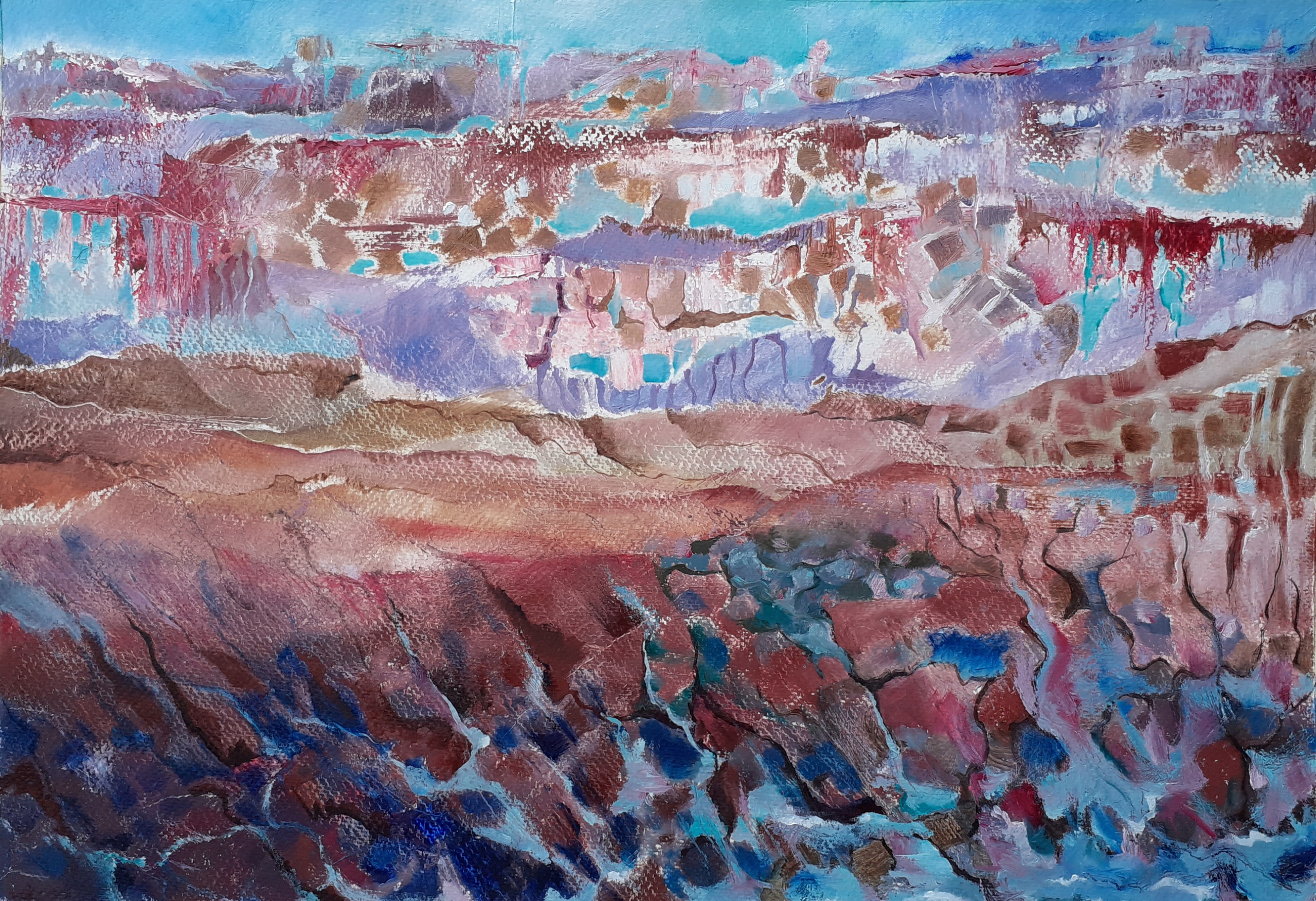 Luchtspiegeling van een stad aan de rand van een ravijn, dat volstroomt met water. Olieverf