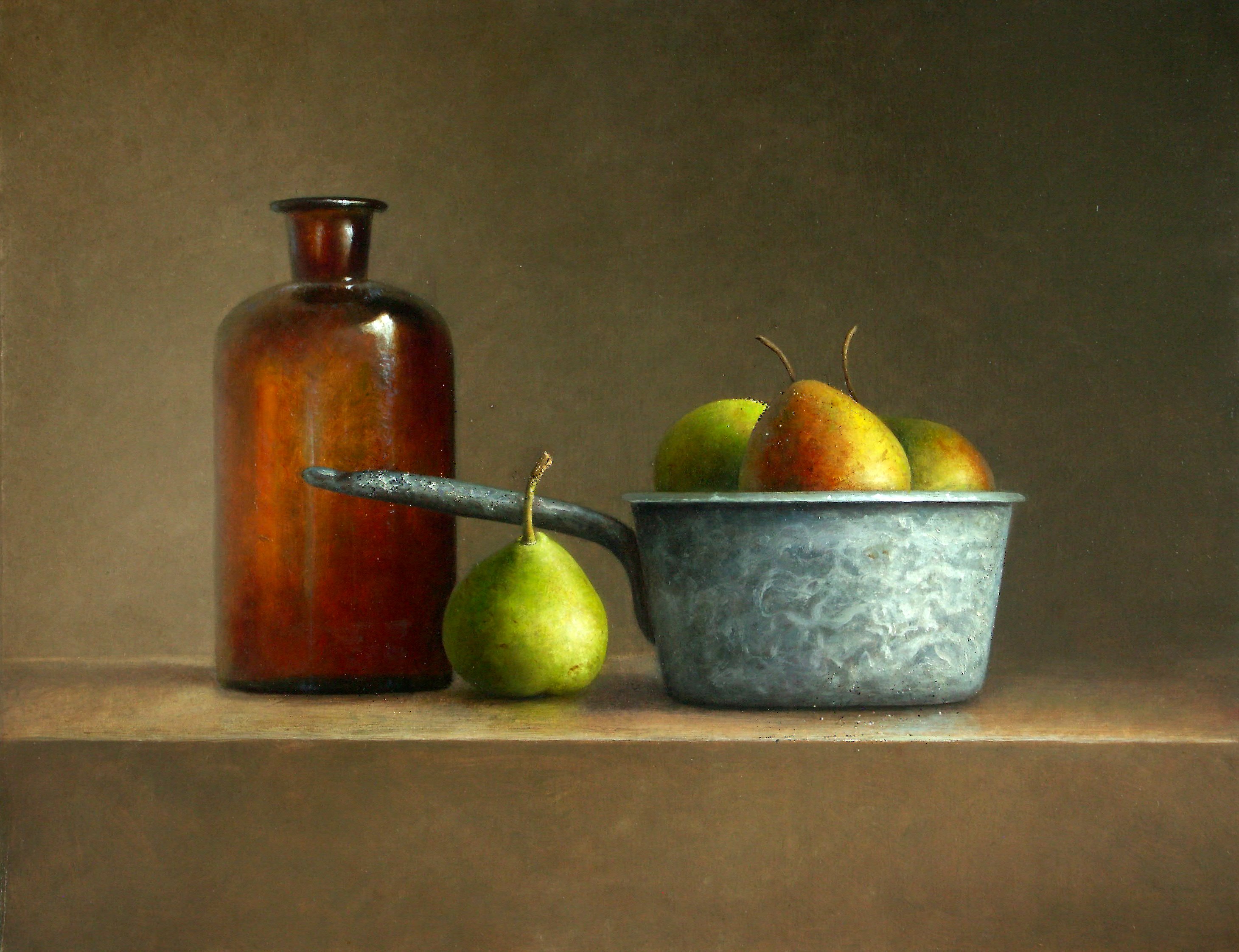 Stilleven met blauw emaille en fles