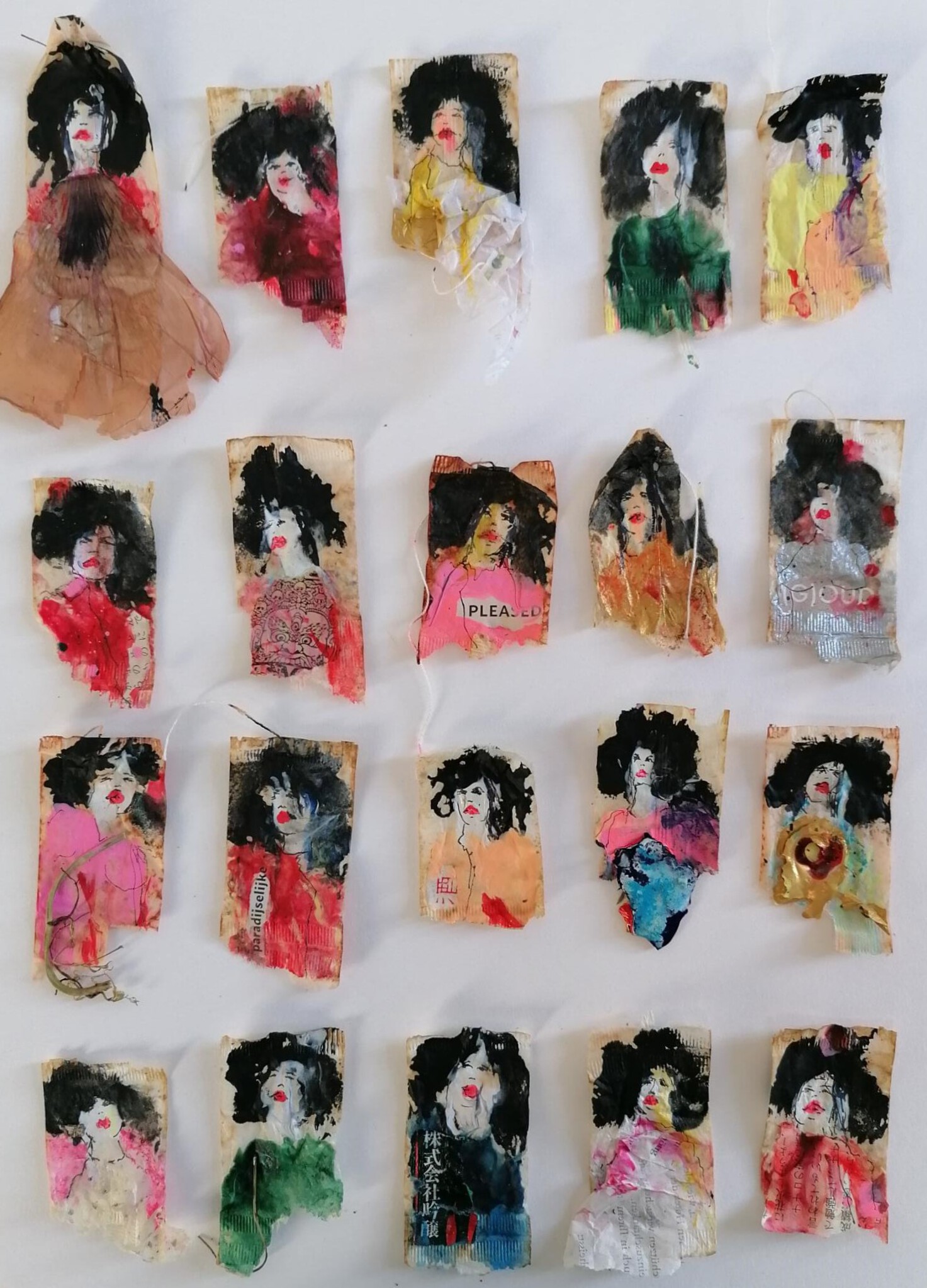 Theezakjes als canvas zorgen voor een inspirerende "voorgekleurde" ondergrond. Met Acryl worden de door mij geliefde Geisha's vorm gegeven. De Geisha's, met hun wit geschminkte en in zijden kimono’s gehulde dames waar een zweem van geheimzinnigheid rond hangt, tonen in stilte op kunstige wijze al hun emoties.