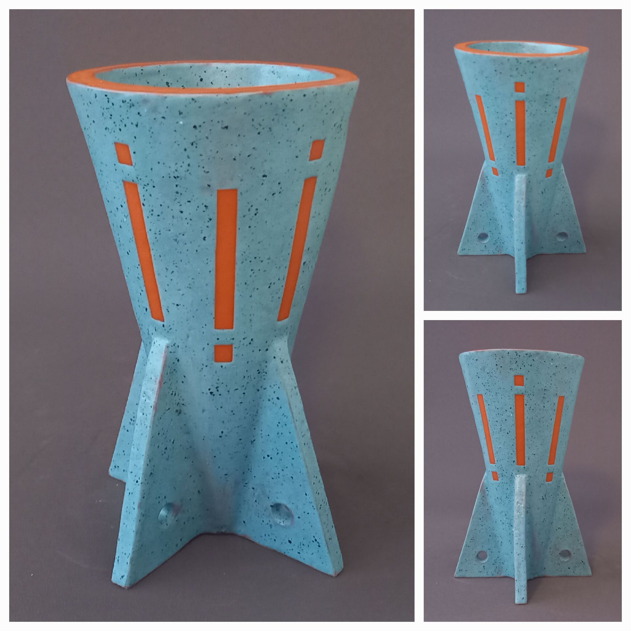 Kegelvaas van rode klei en blauw-gespikkeld glazuur en 4 "steunberen".