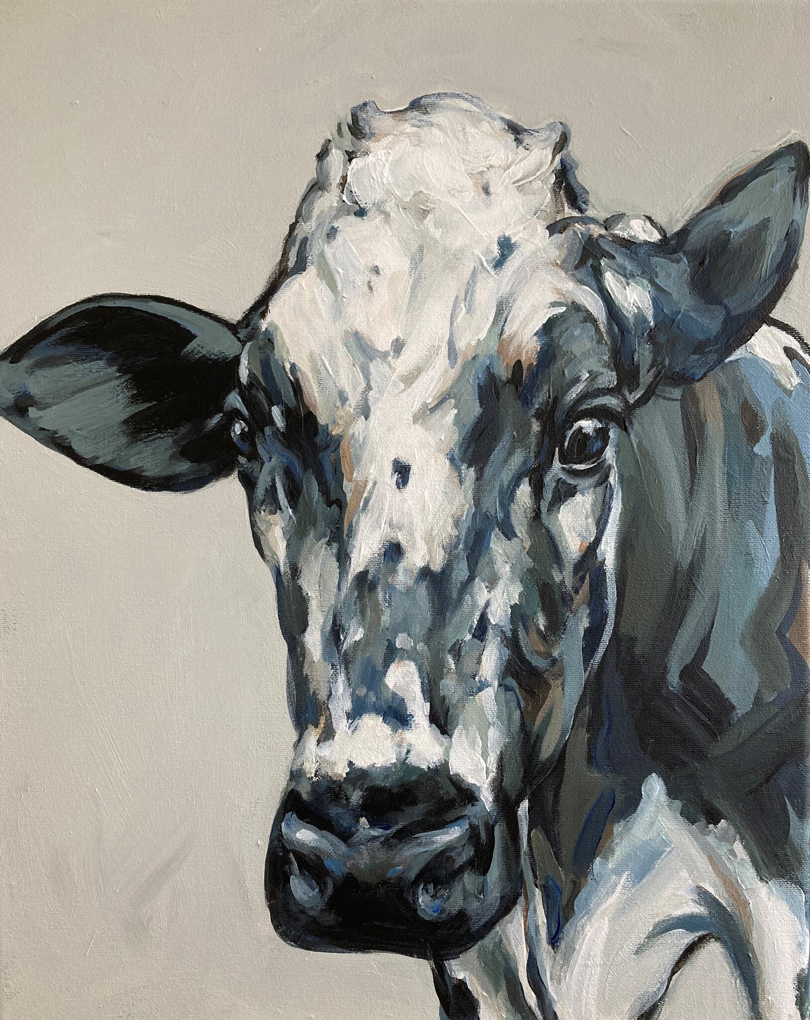 Nelleke schildert voornamelijk koeienschilderijen met een vlotte streek.
