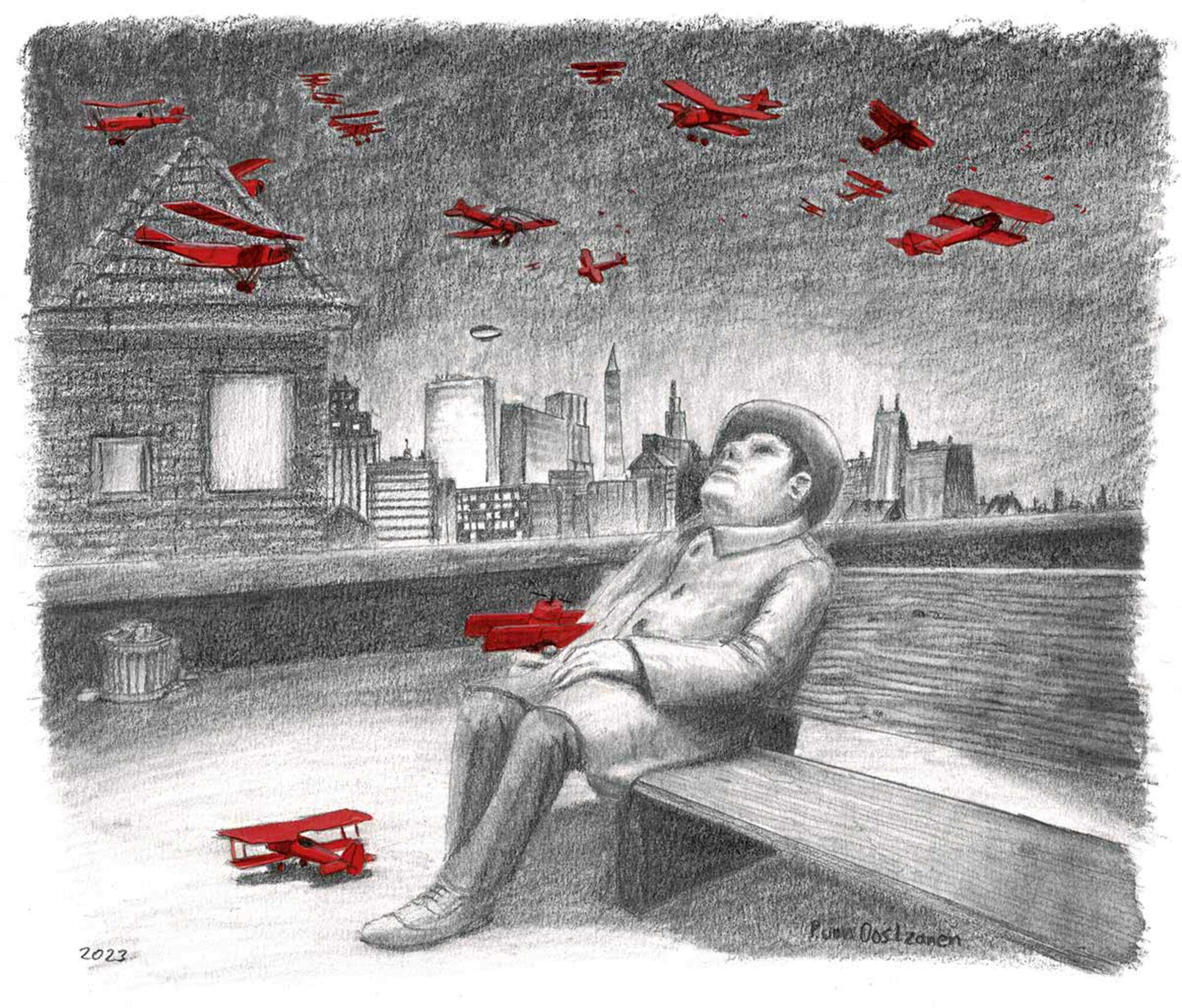 Wit Rood Zwart Man Tekening Vliegtuig Stad