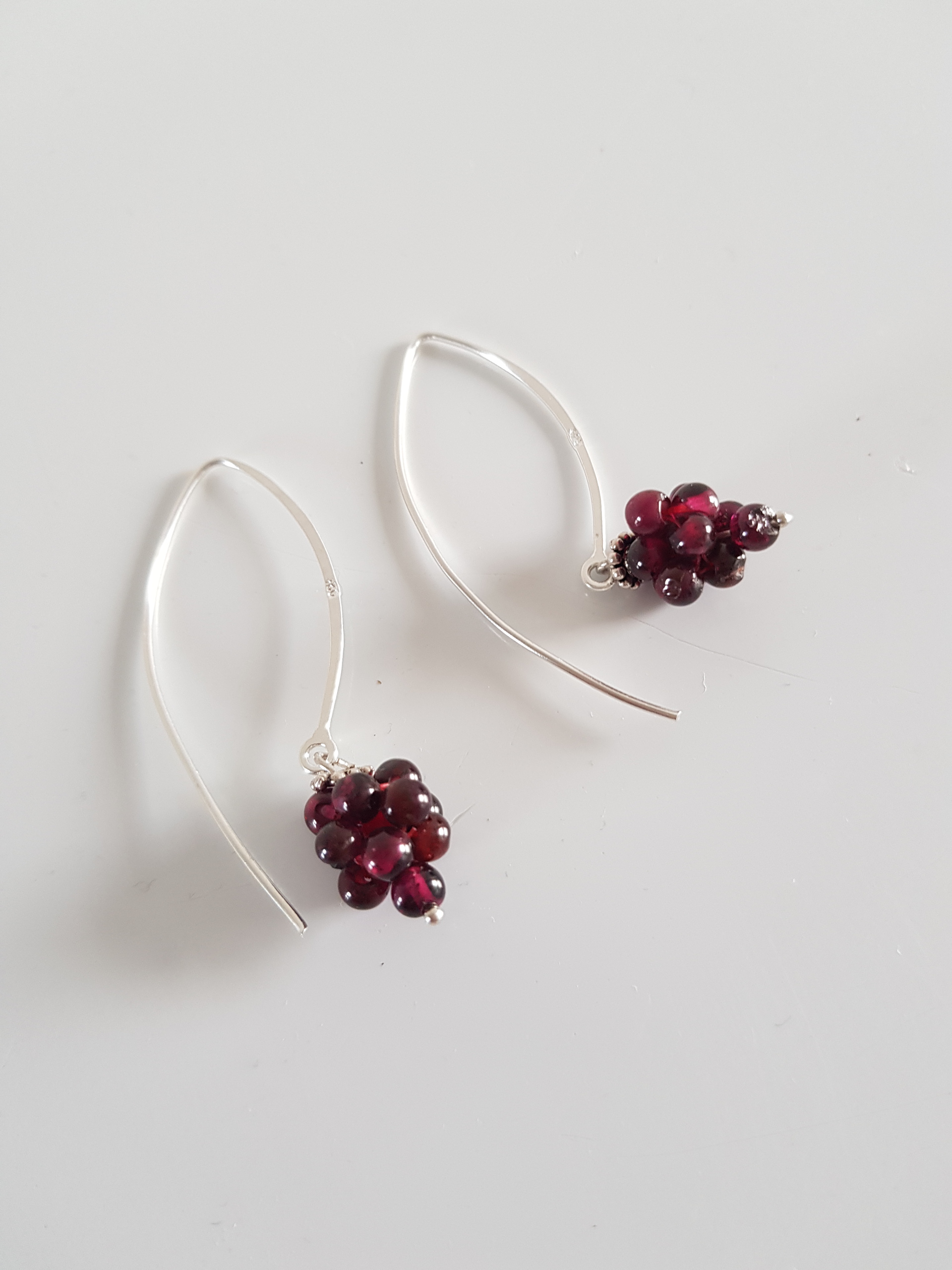 Granaat zilveren lange oorbellen, granaat druiventrosjes, die bungelen aan je oor, rode wijn oorbellen, Nederlands sieraad De Granaat druiventrosjes. hebben een associatie met rode wijn. Deze oorbellen bungelen prachtig aan je oor. Handgemaakte lange sterling zilveren oorbellen. De granaatjes schijnen je warm tegemoet. De zilveren kraal, de granaatsteentjes, geven de oorbel enigszins een antieke uitstraling. Deze sprankelende lange oorbellen zijn heel eenvoudig in en uit te doen, maar hangen heel sierlijk en stevig in het oor.. Lengte is ongeveer 5 cm van top oorbel tot onderkant granaat-druiventrosje. Gewicht van 1 oorbel is 3 gram.