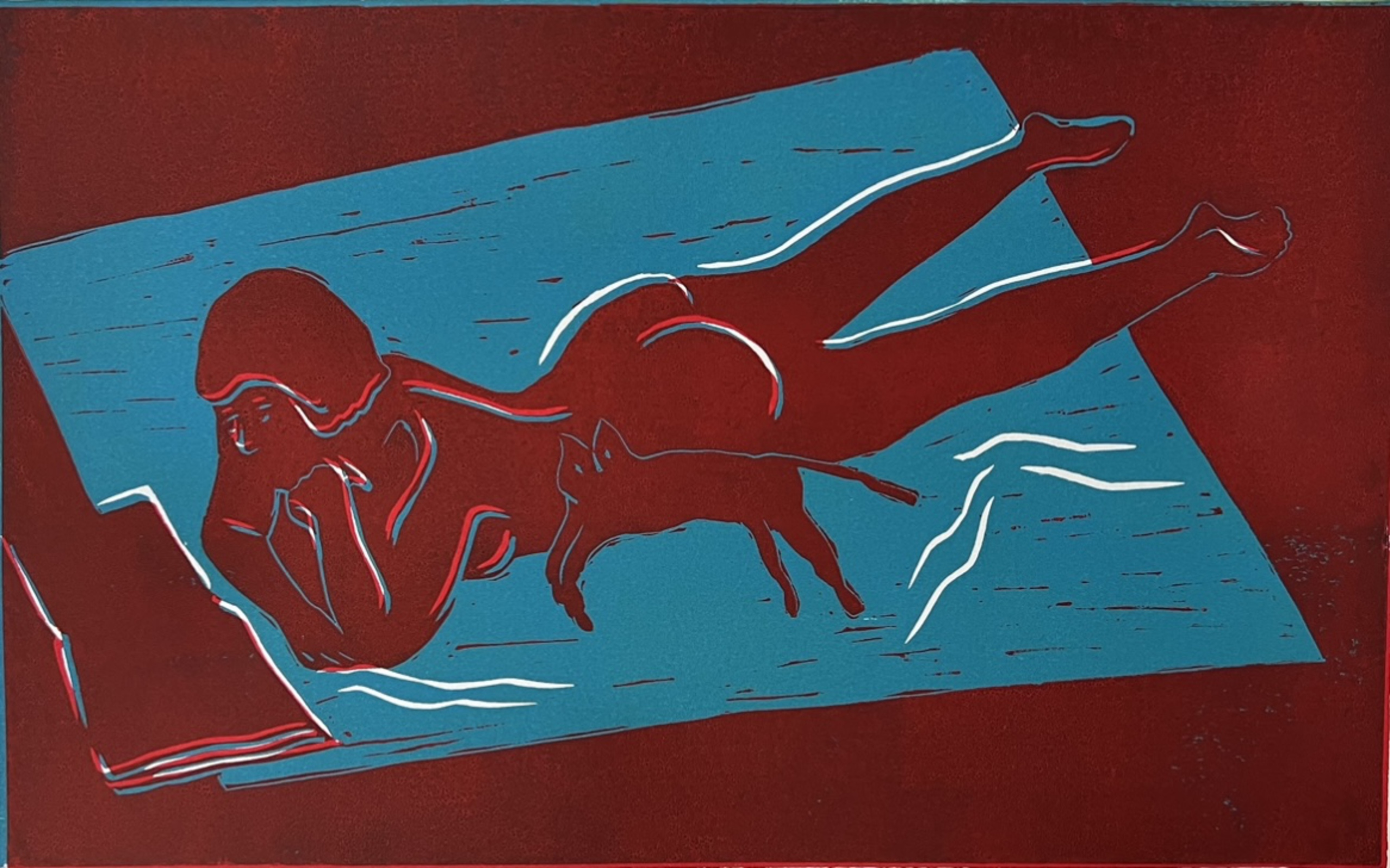 Linoleumprint op papier. Gemaakt dvm reductie methode waarbij je je linoleum steeds wegsnijd alvorens de volgende kleur aan te brengen. Deze voorstelling heb ik verschillende kleuren combinaties gemaakt. Deze rode dame ligt met rode kat op haar lichtblauwe doek.
