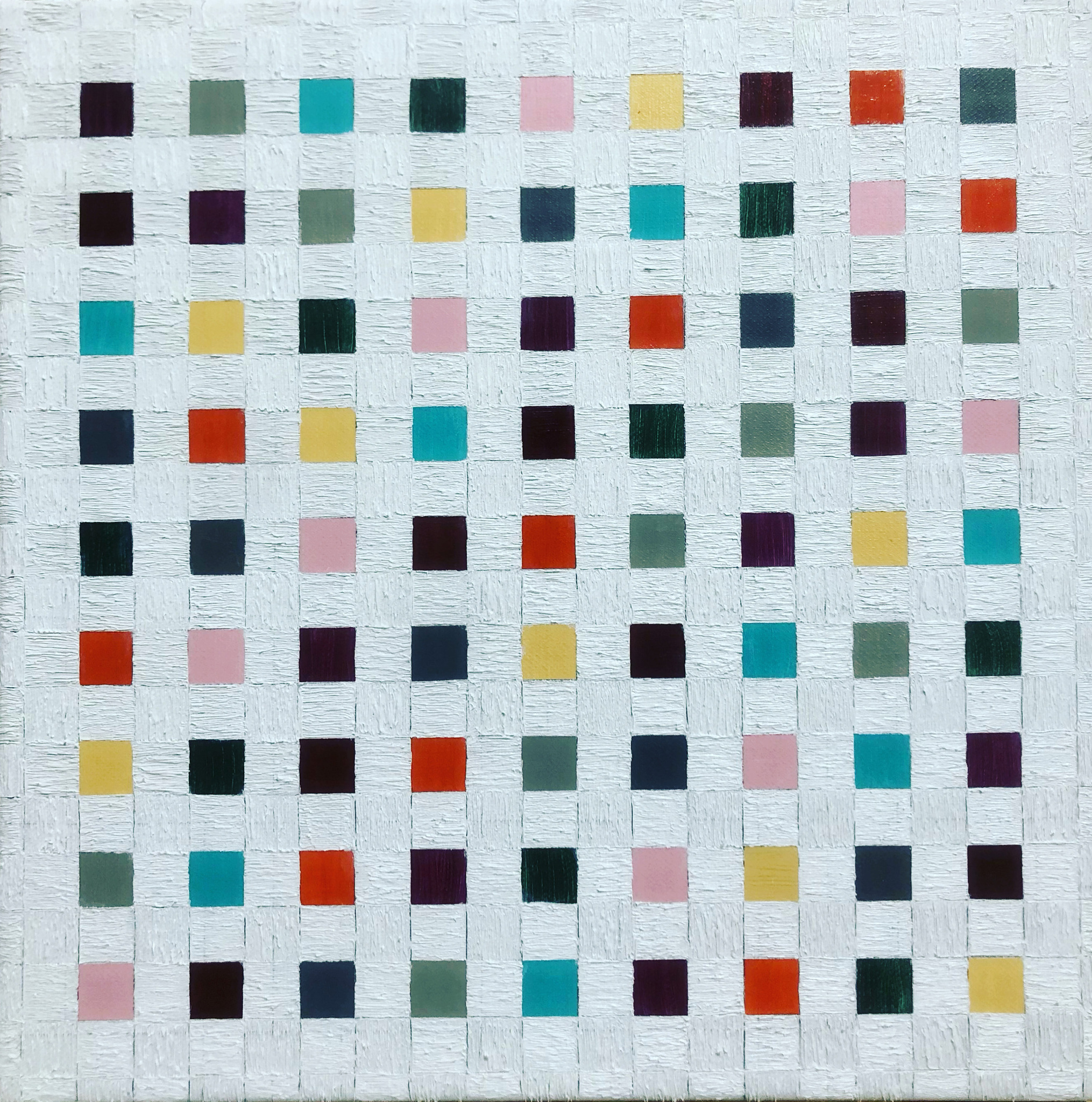 Thema: Chaos (Geometrische Chaos) Mijn kunst is beïnvloedt door de moderne wiskundige en wetenschappelijke benadering van het begrip complexe orde van de natuur. Met name heb ik me verdiept in de Chaos theorie en de fractal geometrie. Ik ben geen wiskundige, en ik gebruik geen wiskundige formules. De ideeën van de Chaos theorie en fractal geometrie leiden tot de ontwikkeling van de composities in mijn werk. Ik gebruik driehoeken,vierkanten en cirkels in mijn schilderijen, maar in mijn huidige serie, geoChao richt ik me alleen op de vierkanten en de verhoudingen tussen de vierkanten. Ik ontwikkel mijn composities door kleine vierkantjes op grote te zetten of grote op kleine te zetten. Het gaat om de onderlinge verhoudingen tussen de vierkanten. Ik laat de methode die ik kies de compositi