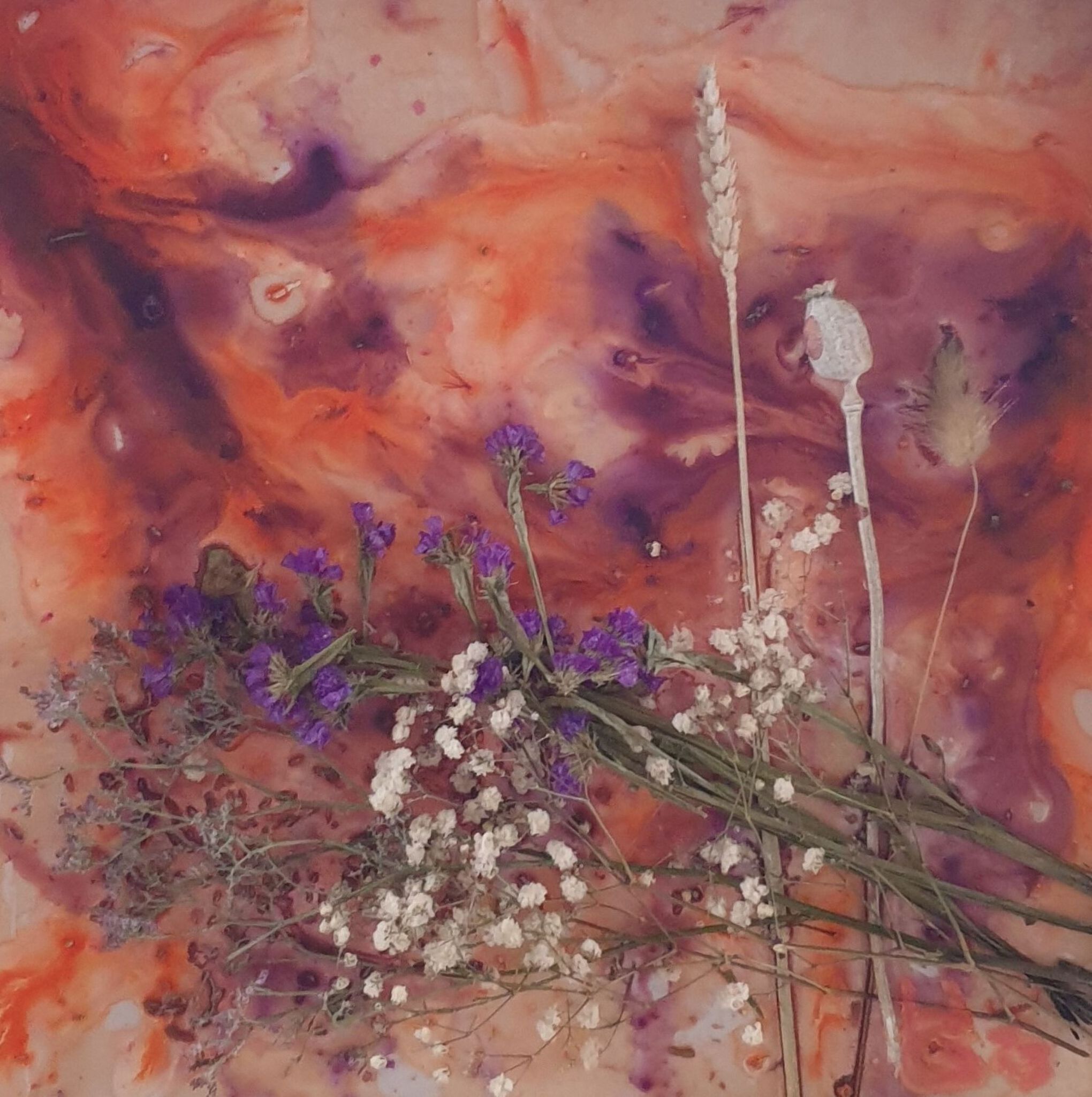 Mixed Media met acrylverf en gerecyclede bloemen