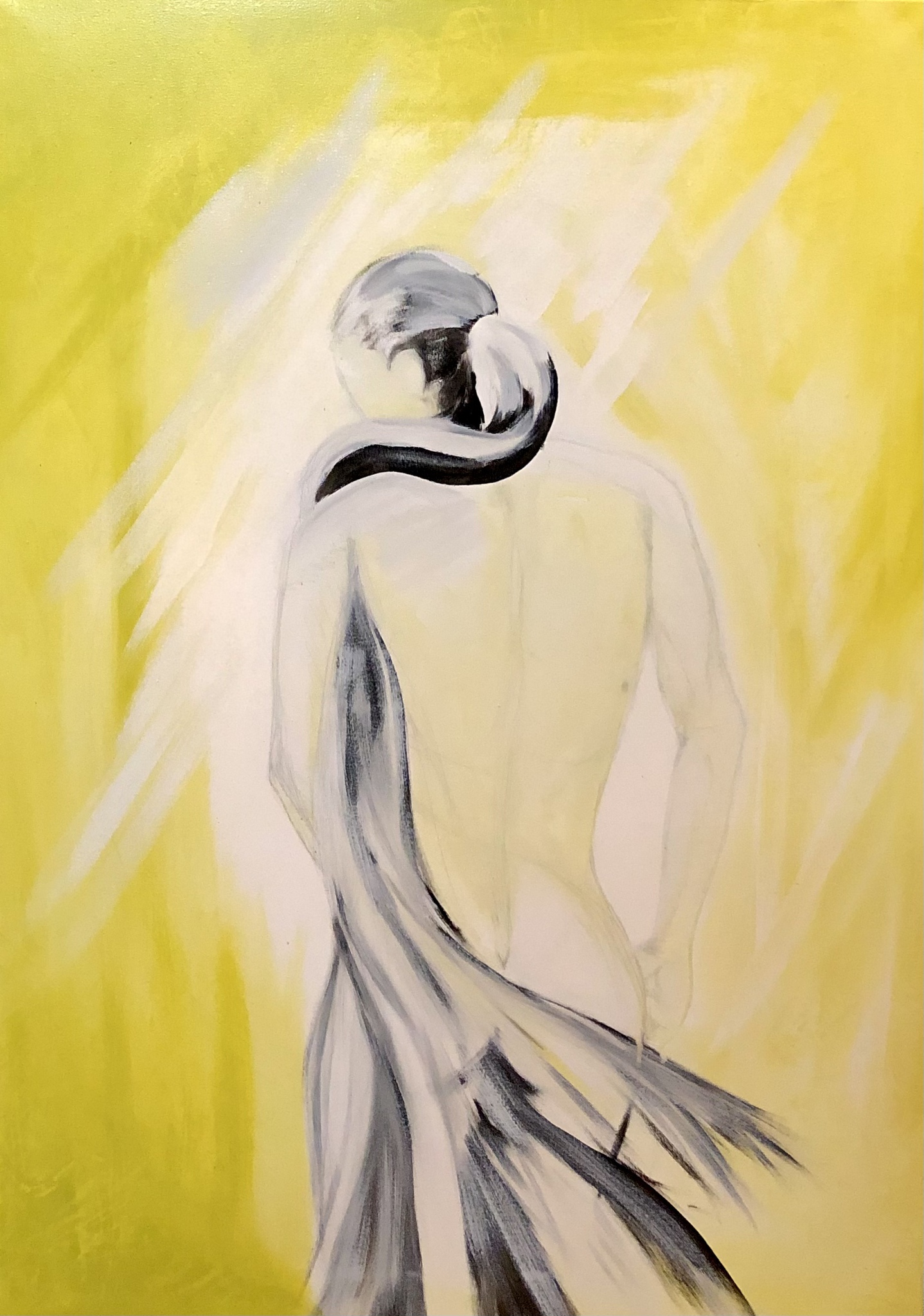 Intuïtief opgezet. Het zoeken naar eigen vrouwelijk schoon. Een proces, het ontluiken. Alkydverf op linnen