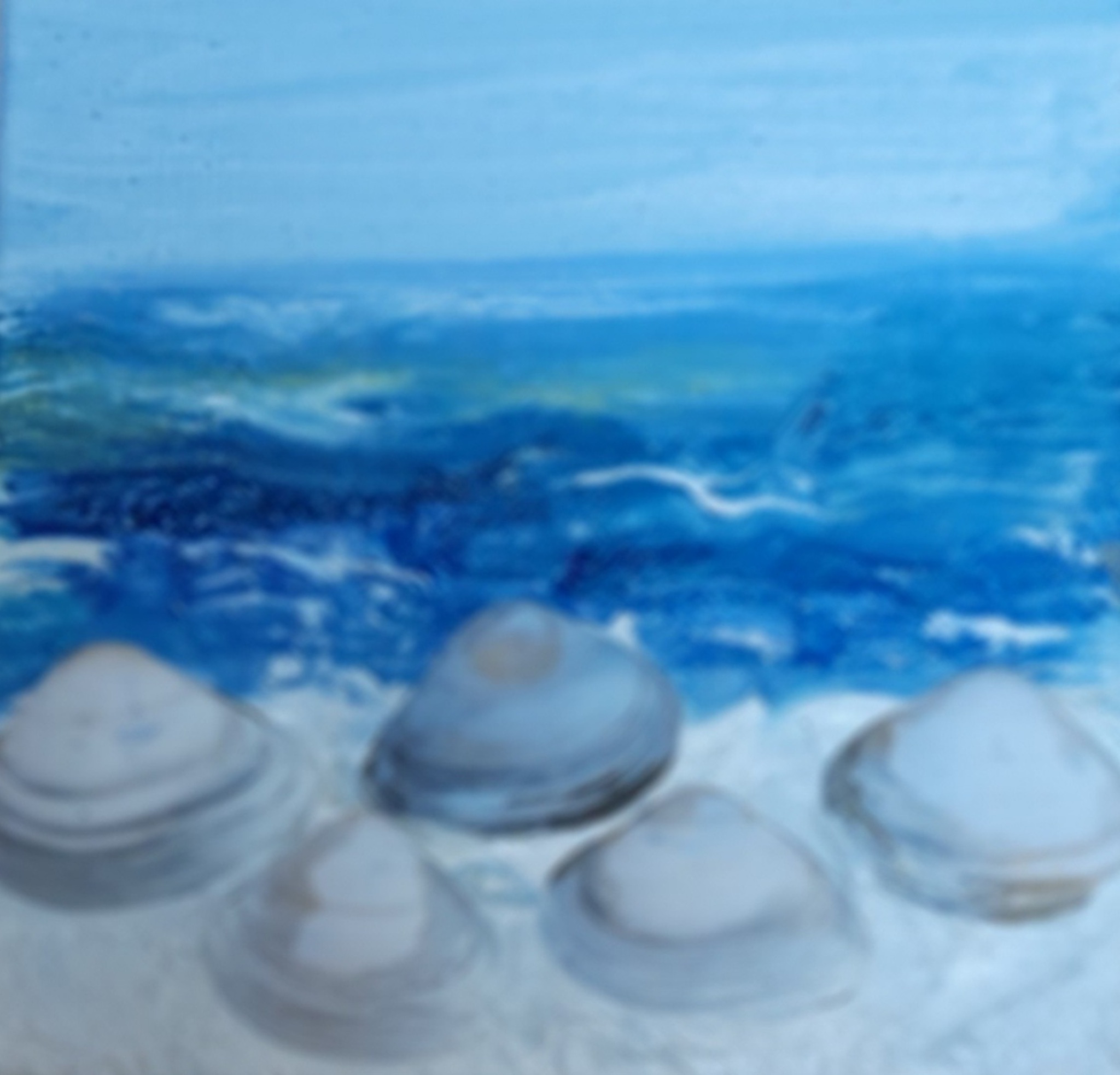 Gemengde techniek, acryl, zand, olieverf, paletmes en borstel en schelpen