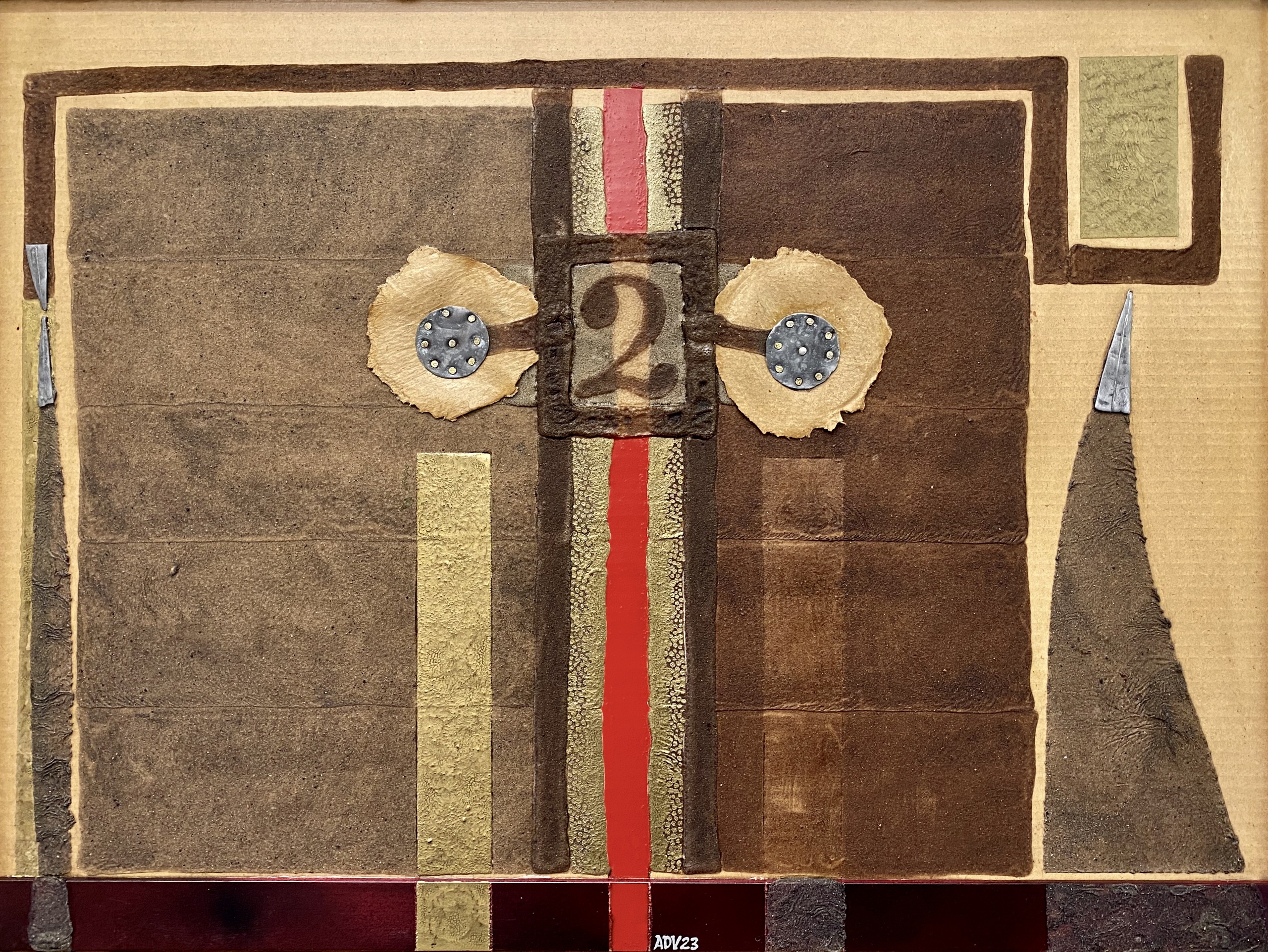 Oud werk uit 1987, opnieuw bewerkt in 2023. Basis: zand op karton van doos. Toegevoegd: gescheurd karton, lood, spijkertjes en hout. Kleuren: rood en goud.
