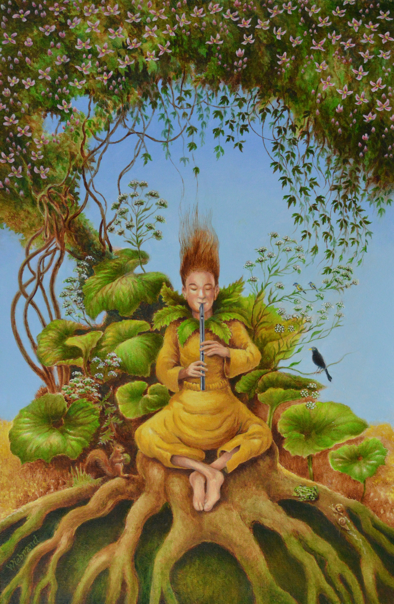 Schilderij Landschap Spiritueel Bloemen Dieren Figuur Tuin Kikker Kunst Natuur Realisme Geluk Vogels Planten Eekhoorn Fluitspeler Clematis Levenslust Slakken Keltisch Verlicht