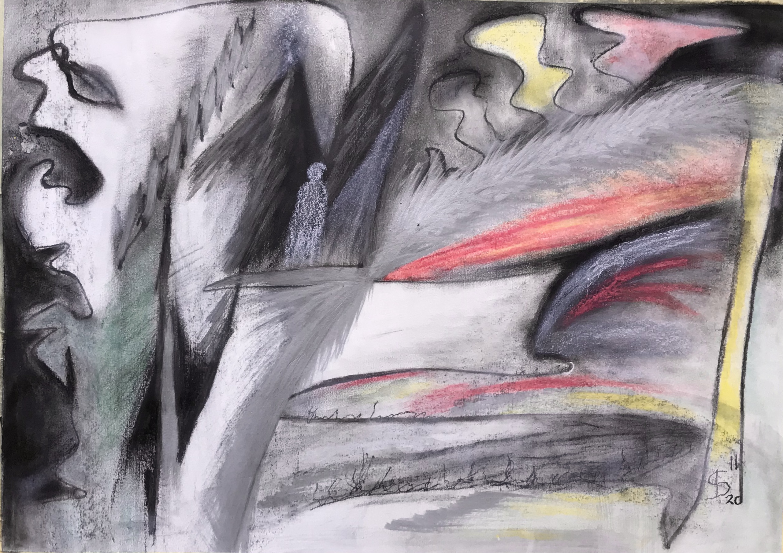 Abstract Rood Geel Zwart Landschap Groen Krijt Figuur Acrylverf Nacht Zilver Houtskool Pastelkrijt Droom Brug Rivier Molen Symbolisch Bossen Expressionisme Mythisch Zwart-wit