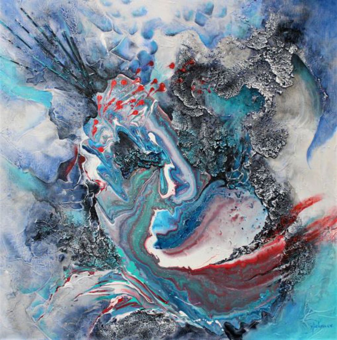 Schilderij in mixed media op linnen (alu frame) met baklijst