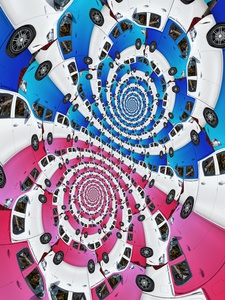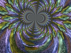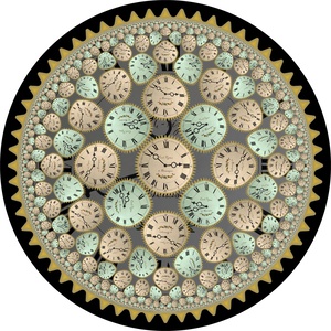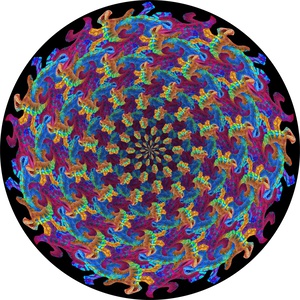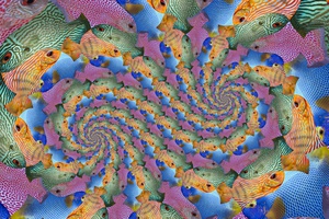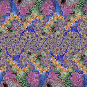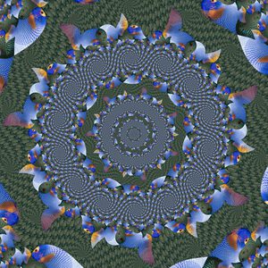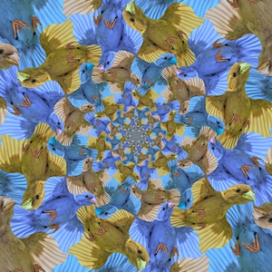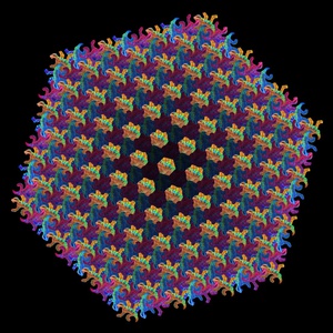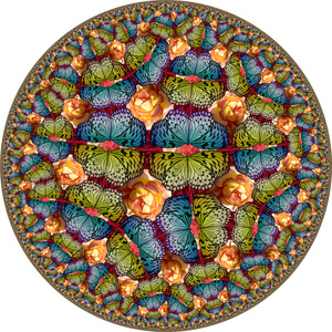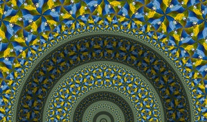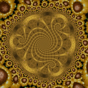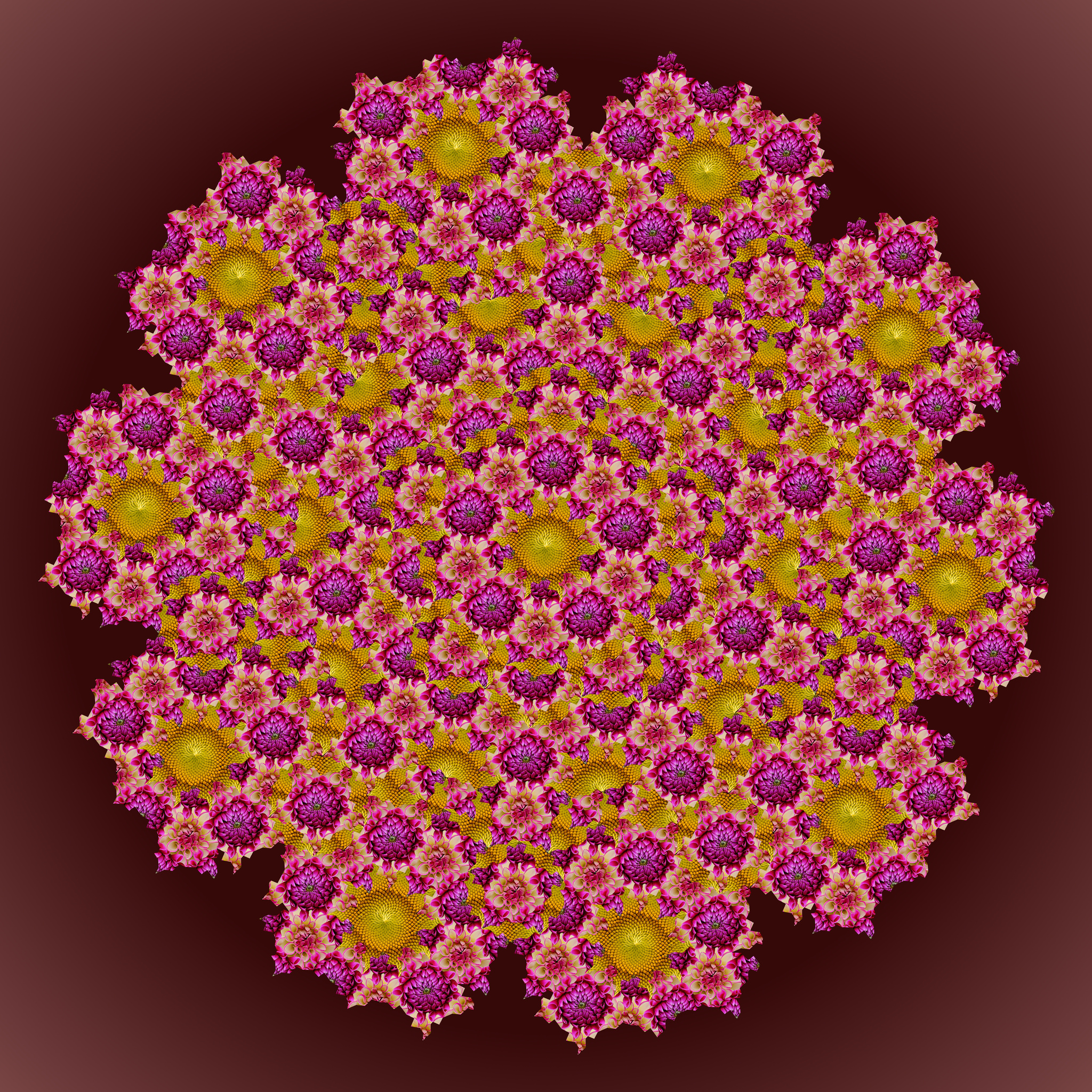 Deze niet-periodieke, Penrose P3 afbeelding met 5-voudige rotatiesymmetrie rond de middelste zonnebloem is gemaakt van vervormde ruiten. De ruiten bevatten een zonnebloem en 2 dahlia's zodanig dat naburige ruiten van dezelfde bloem continu zijn. Dit type afbeelding bestaat uit 5 dunne ruiten met hoeken van pi/5 en 4*pi/5, en 5 dikke ruiten met hoeken van 2*pi/5 en 3*pi/5. De zonnebloem is gemaakt van 5 paar dunne ruiten. De tegenovergestelde scherpe hoeken van deze ruiten ontmoeten elkaar in het midden van de zonnebloem. De zonnebloemfoto heeft geen rotatie- of spiegelsymmetrie; hij is vanuit het midden in 10 stukken gesneden, en 2 tegenover elkaar liggende stukken worden weergegeven in een enkele vervormde ruit, wat enige beeldbewerking vereist. Elke volledige dahlia is gemaakt van 5 dikke ruiten met hun scherpe hoeken in het midden. Door elke ruit naar de andere kant van het midden te verplaatsen, krijg je een dahlia met de andere kleur, rood of wit. Dus de helft van een dikke ruit draagt bij aan een rode dahlia en de andere helft aan de witte dahlia. Rond de middelste zonnebloem zit een kroon van 5 rode dahlia's en 5 witte dahlia's. Een rode dahlia deelt 2 dikke ruiten met zijn beide naburige witte dahlia’s. Let ook op de onderkant, voor het patroon van een witte dahlia omgeven door 5 witte dahlia's; en links en rechts daarvan een rode dahlia omgeven door 5 rode dahlia's, enz. De multigrid-aanpak van N.G. de Bruijn, mijn voormalige professor, is toegepast om het hele beeld te construeren.