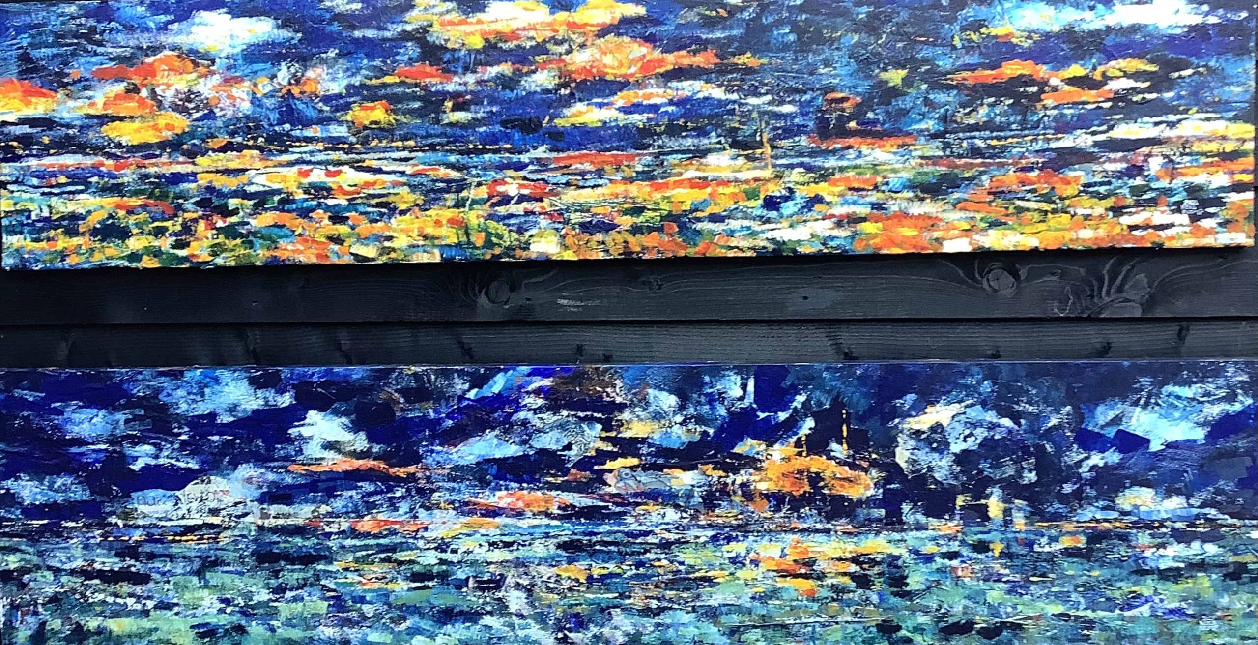 Expressionistische weergave im acrylverf en papiercollage op vezelplaat. Twee werken.