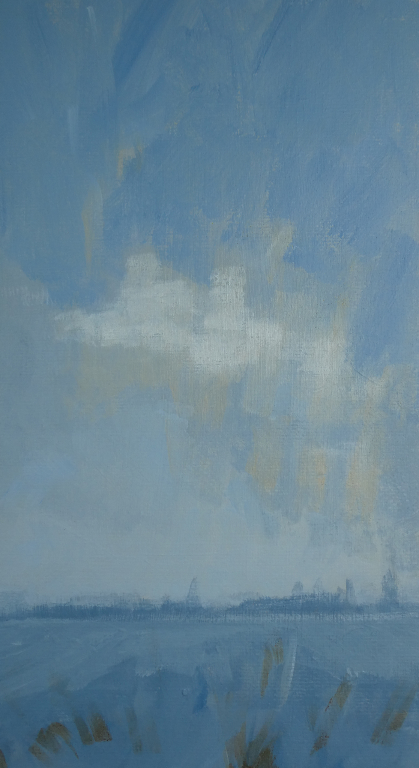 Er is nog weinig te zien op het land. Des te meer in de lucht: Een spel van grijzen en blauwen. Dit schilderij in acrylverf op karton wordt goed verpakt.