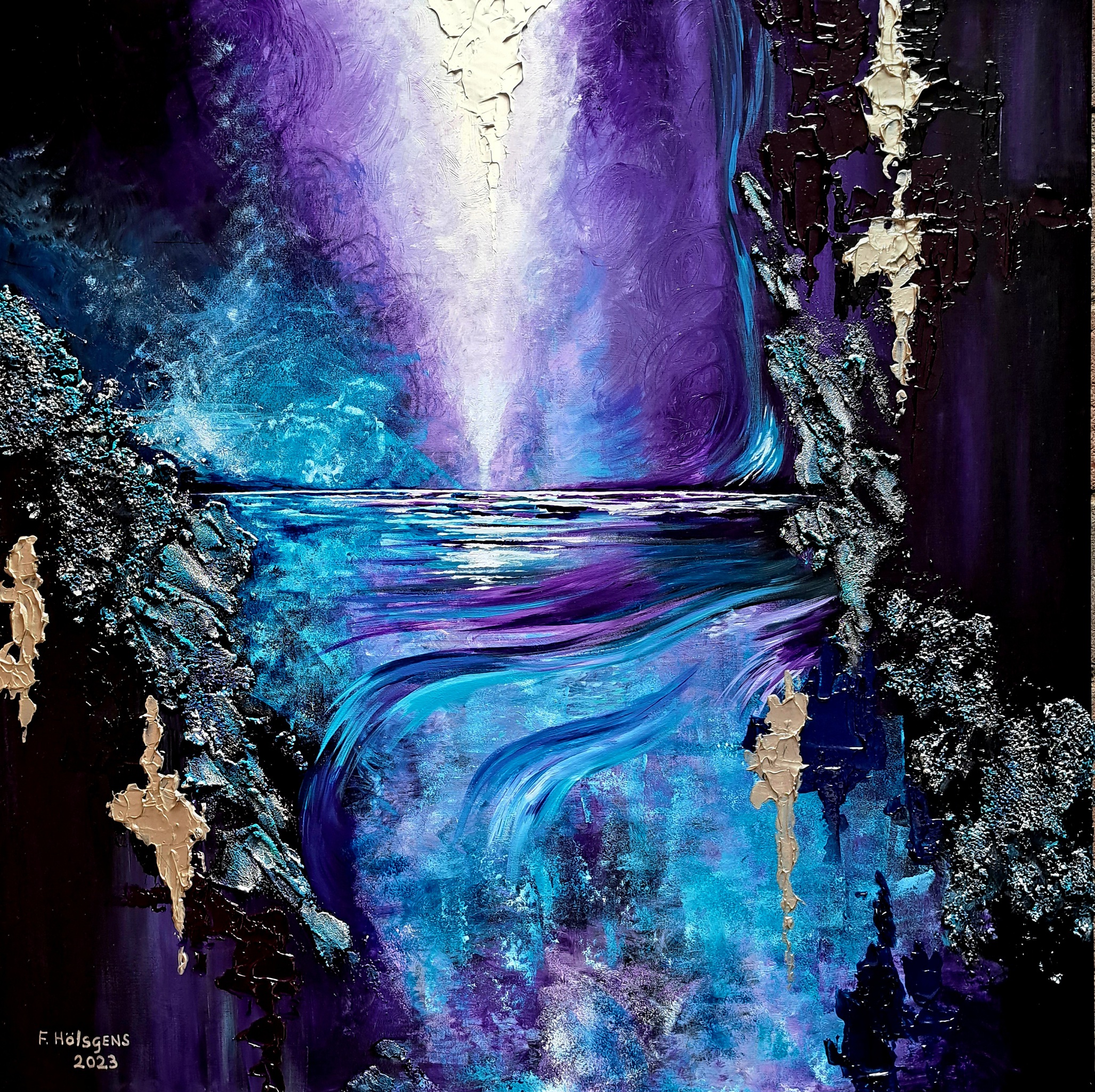 "Panta Rhei" Alles stroomt. Alles is in beweging. In de kunst, in de wereld, in het universum. En in mijn ontwikkeling als kunstenaar. De stromende beweging is in dit kunstwerk nadrukkelijk aanwezig. Ik heb dit keer wederom gekozen voor een donkere achtergrond waarin clair/obscuur-effecten zorgen voor diepte. De structuurmaterialen hebben ook weer hun aandeel in de dieptewerking. Dit eerste schilderij in 2023 is een eerste aanzet tot een serie van een aantal werken waarin de licht/donkerwerking centraal zal staan.