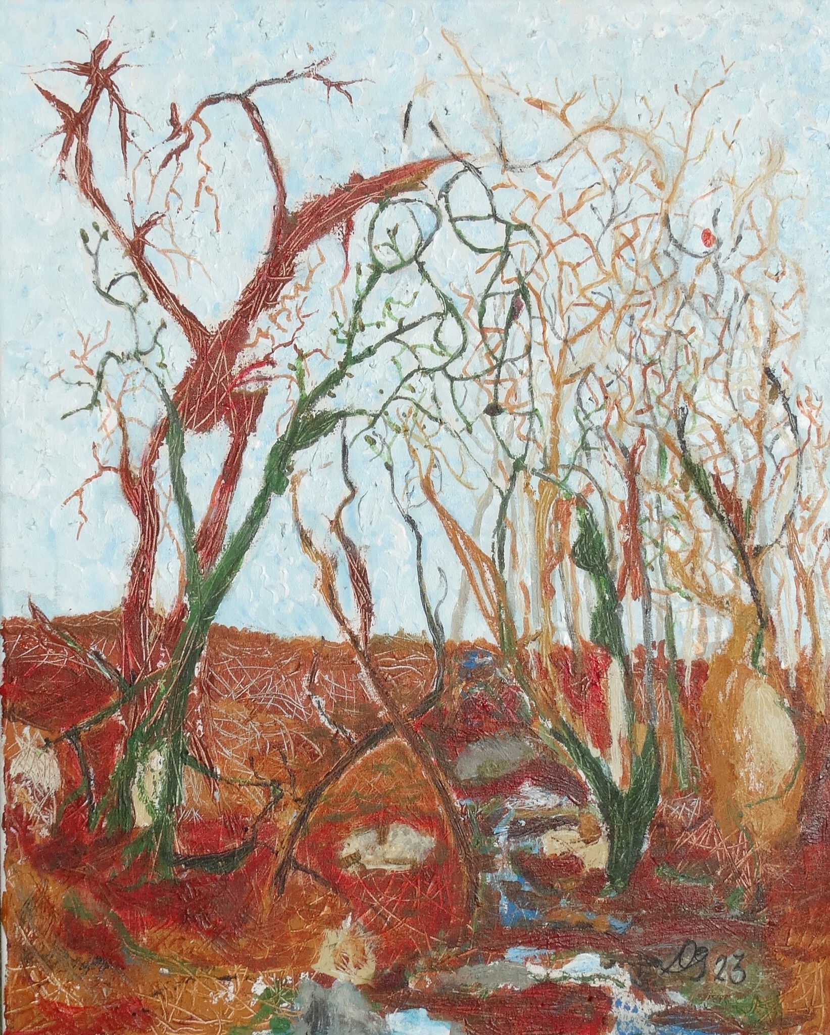 In de winter is het dor, ongelooflijk dat er in het voorjaar weer nieuw leven uitkomt. Althans uit sommige bomen. Gewerkt met paletmet en penseel.