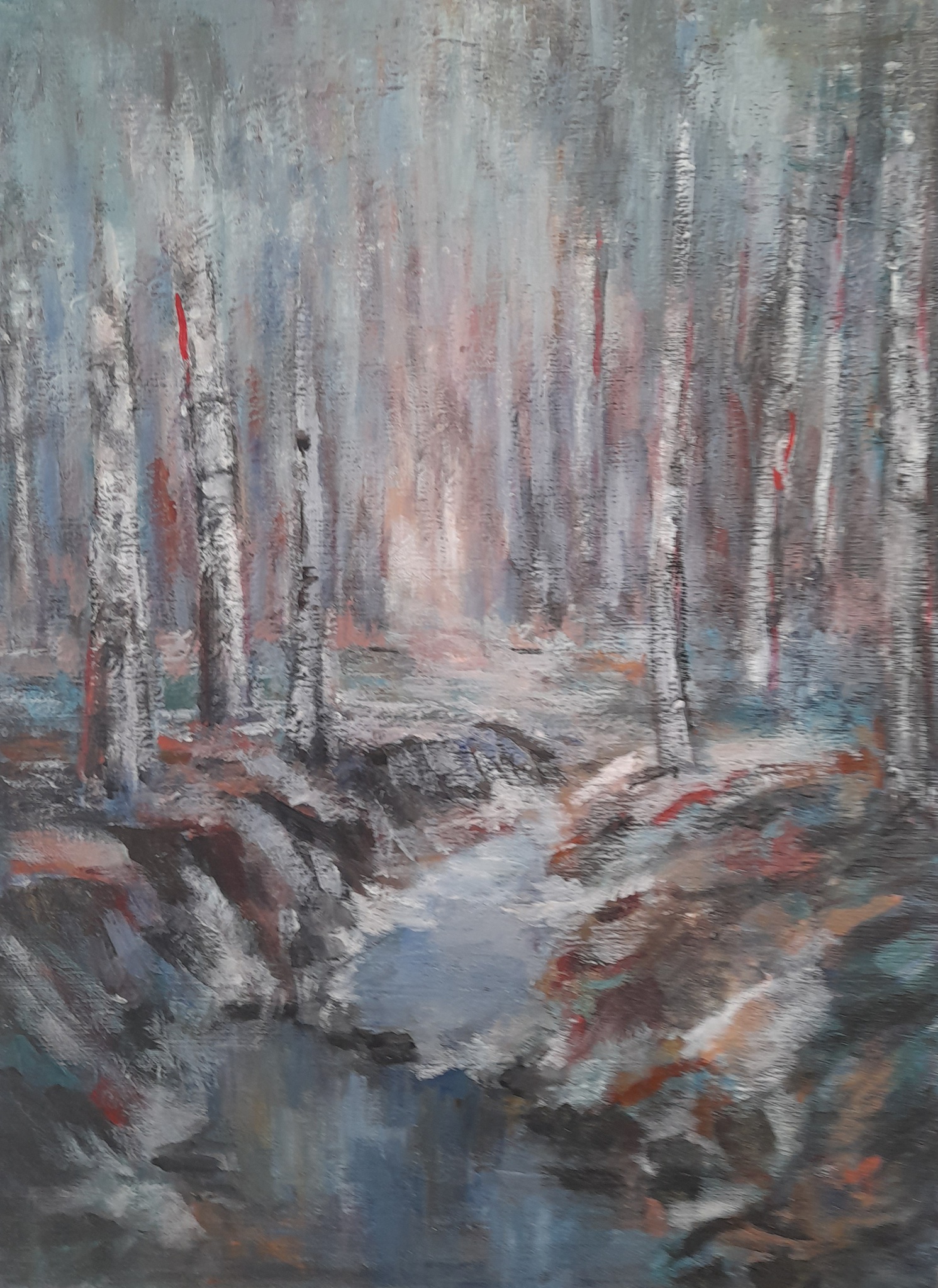 Wit Rood Blauw Acryl Expressief Sneeuw Lyrisch Slootje Berkenboom