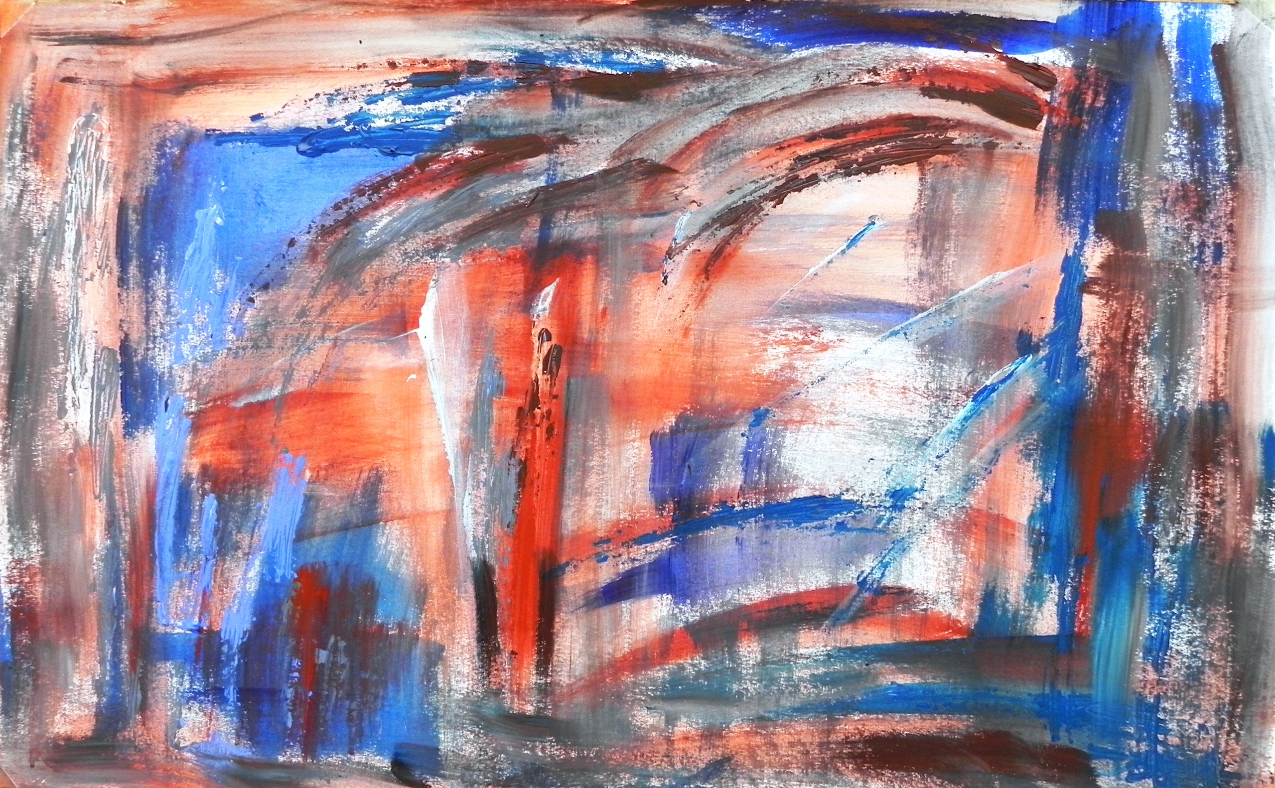 Twee poorten naast elkaar ... waarheen? Keuze tussen een makkelijke en een moeilijke weg? Acrylverf op papier op mdf in baklijst, ca 64 x 90 cm, abstract