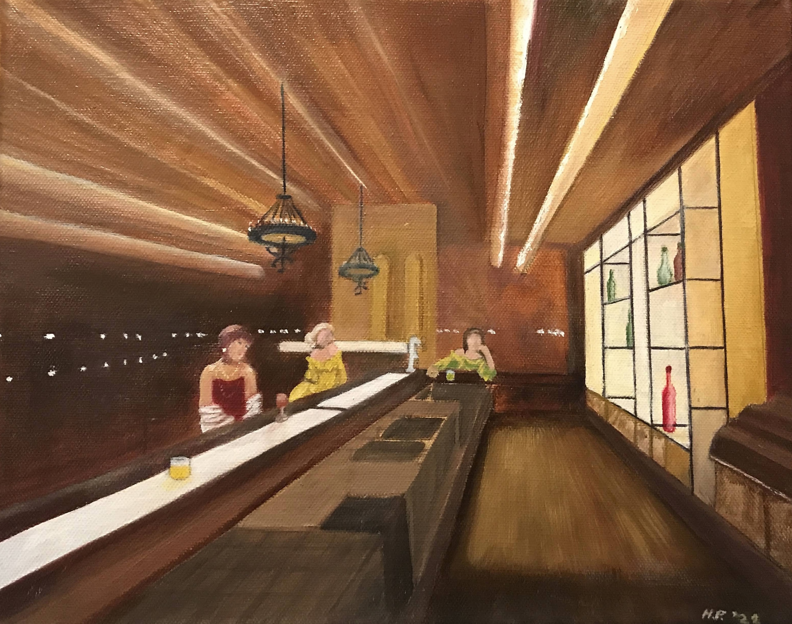 The Grand Ballroom uit de film The Shining. In de stijl van Edward Hopper geschilderd, vooral geprobeerd de eenzaamheid uit te beelden.