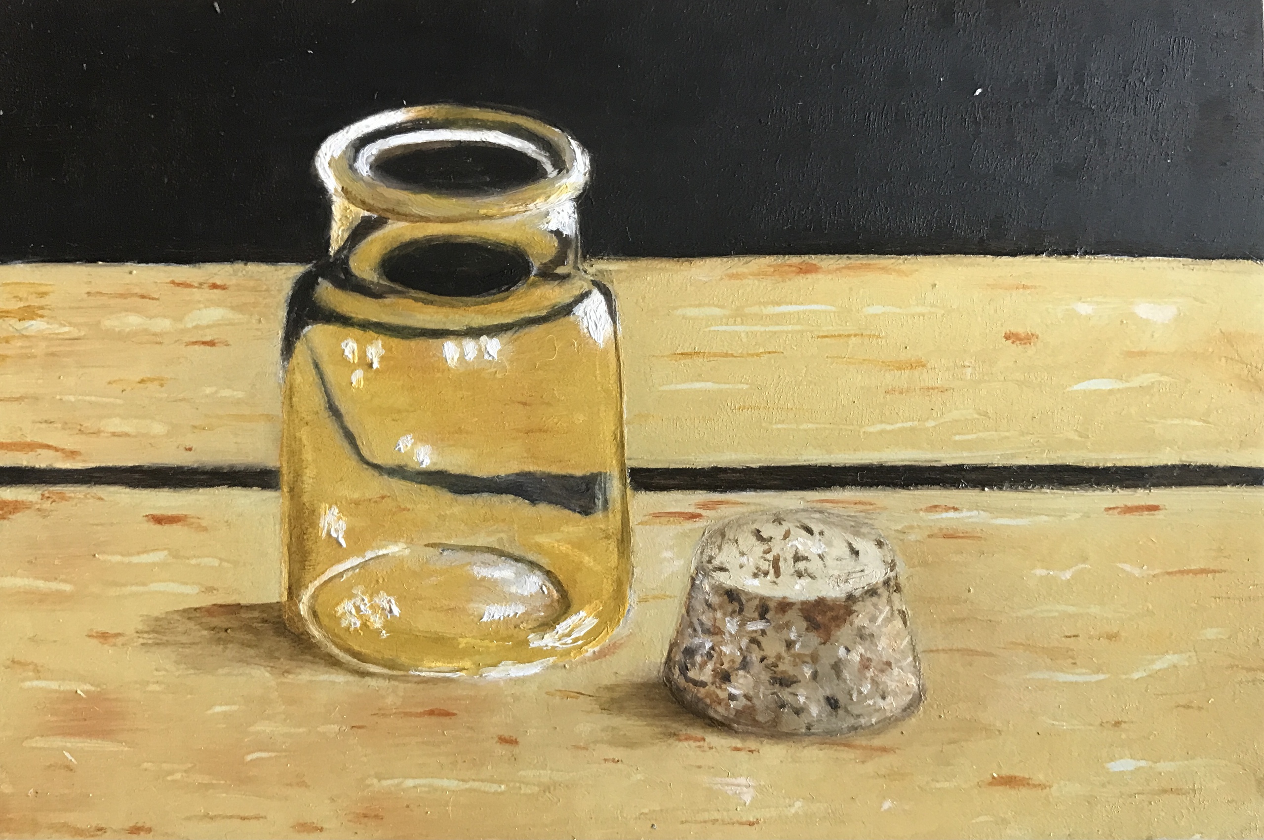 Glas Realistisch Olieverf Paneel Stilleven Fles Plank Houten Fijnschilderen Kurk Miniatuur Potje