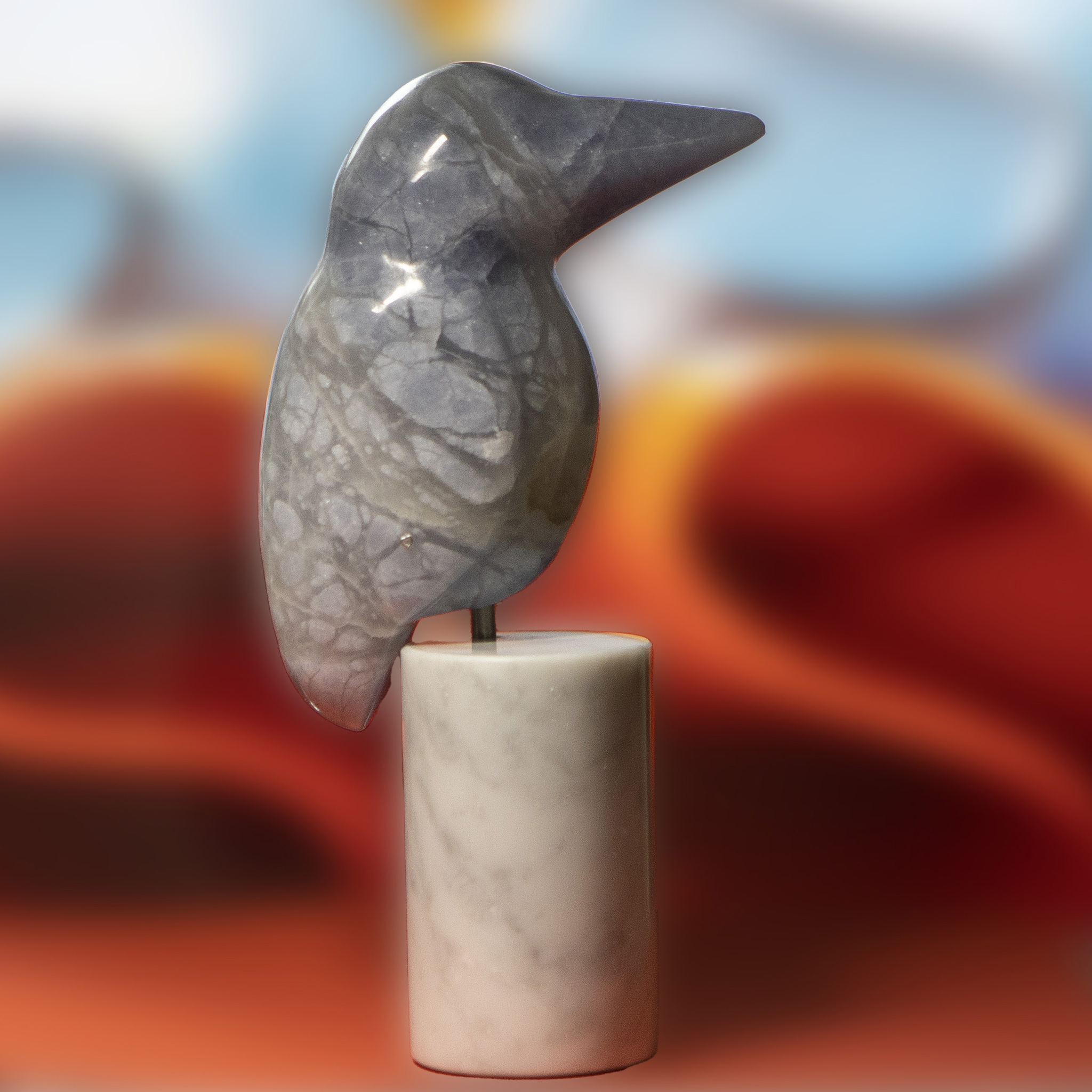 ijsvogel van blauwe albast op sokkel van marmer