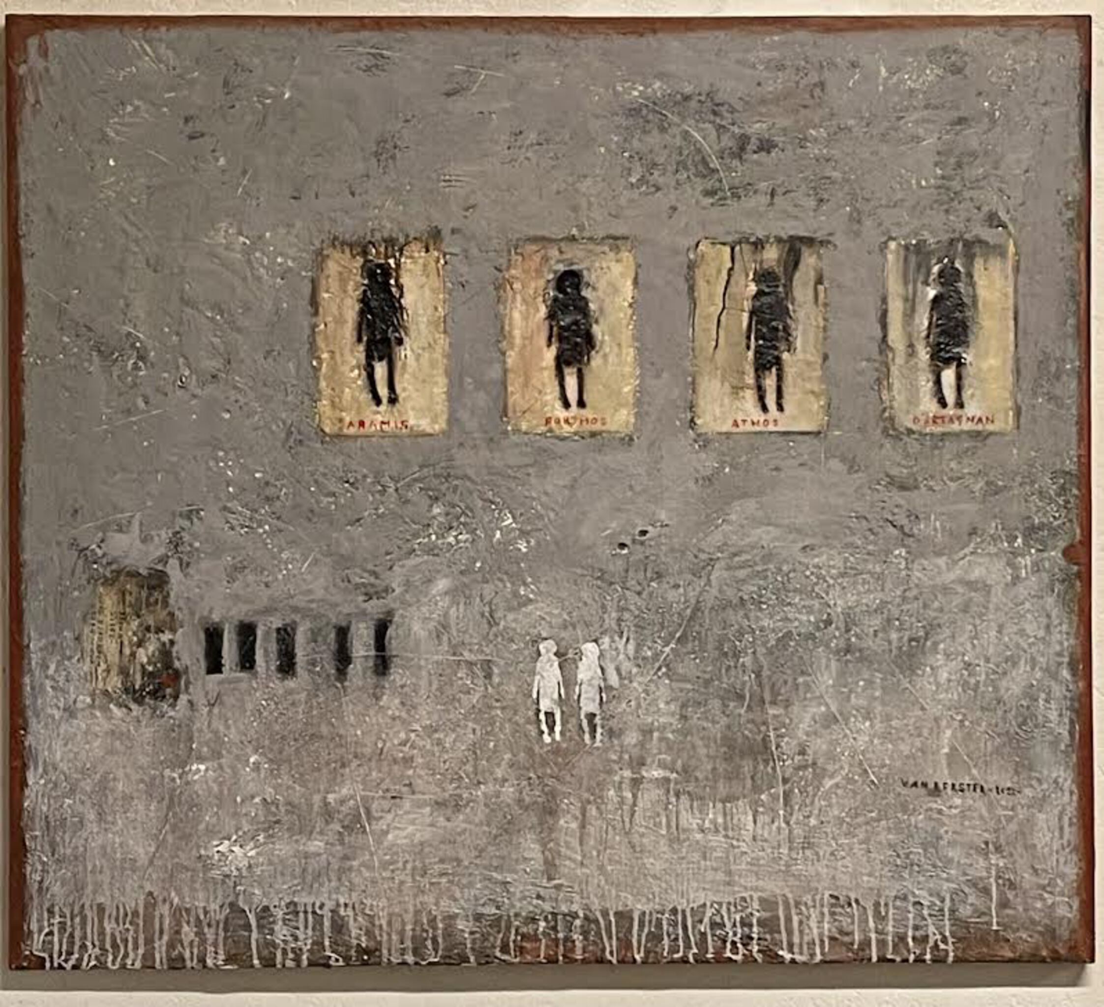 Vier mensvormen met namen....in een grijs met wit gelaagd vlak...