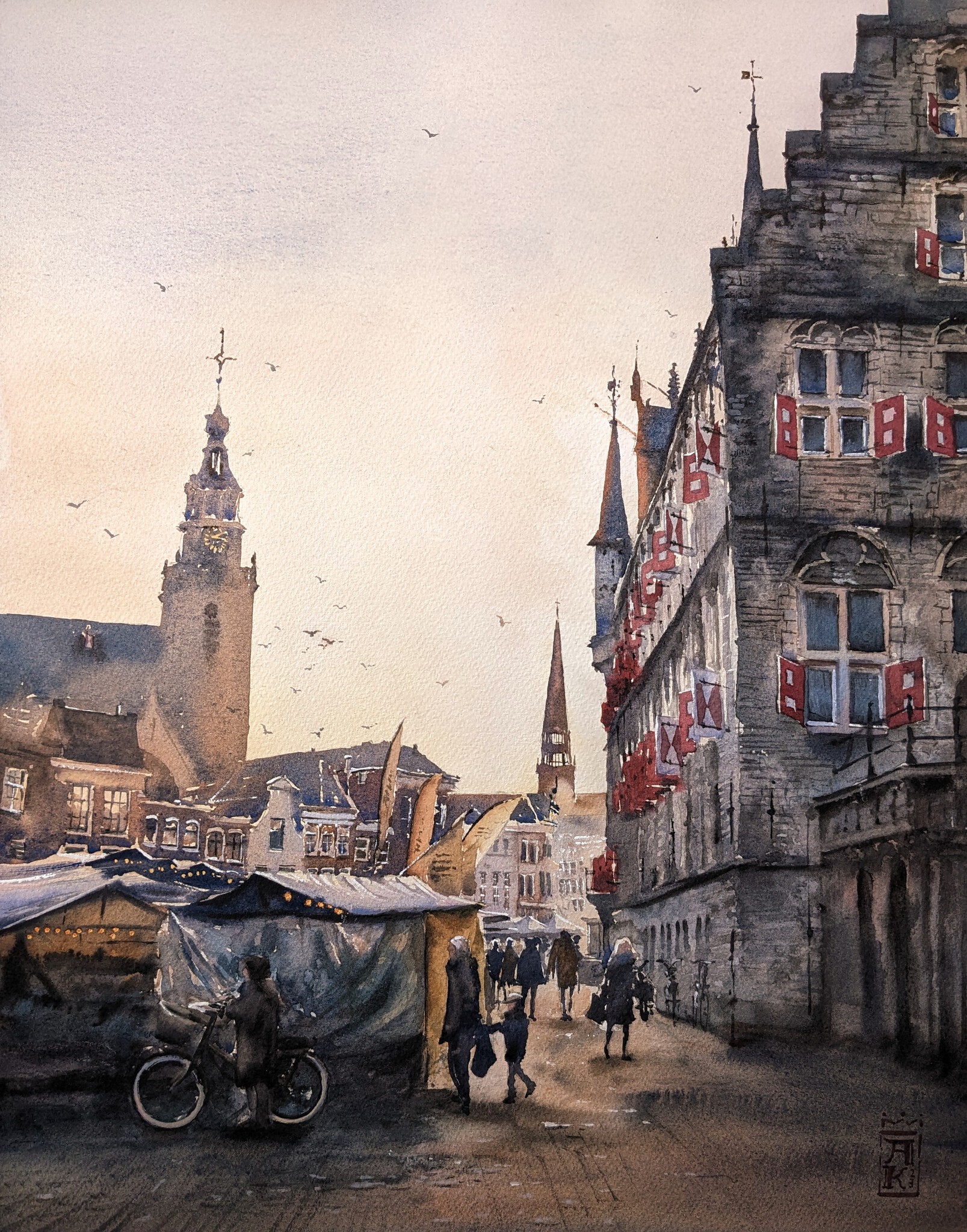 Aquarel Realistisch Painting Watercolor Stad Town Markt Middeleeuws Medieval Market Realistic Stadhuis Gouda Townscape