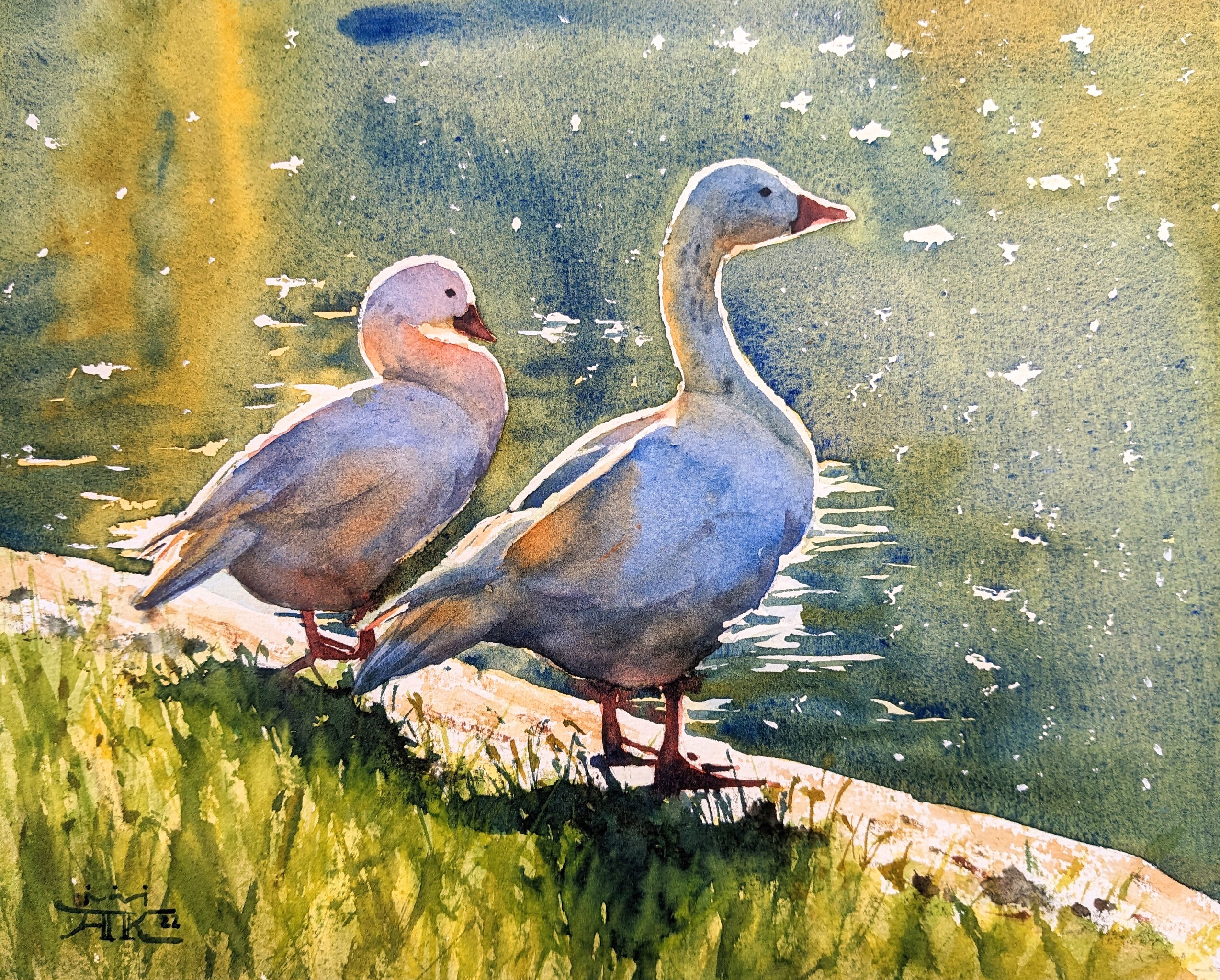 Twee ganzen baden in de warme nazomerzon. Hun lichamen een lavendelkleurig silhouet, omringd met licht. De kleuren vloeien rijkelijk in de reflecties van het water. (VERKOCHT)