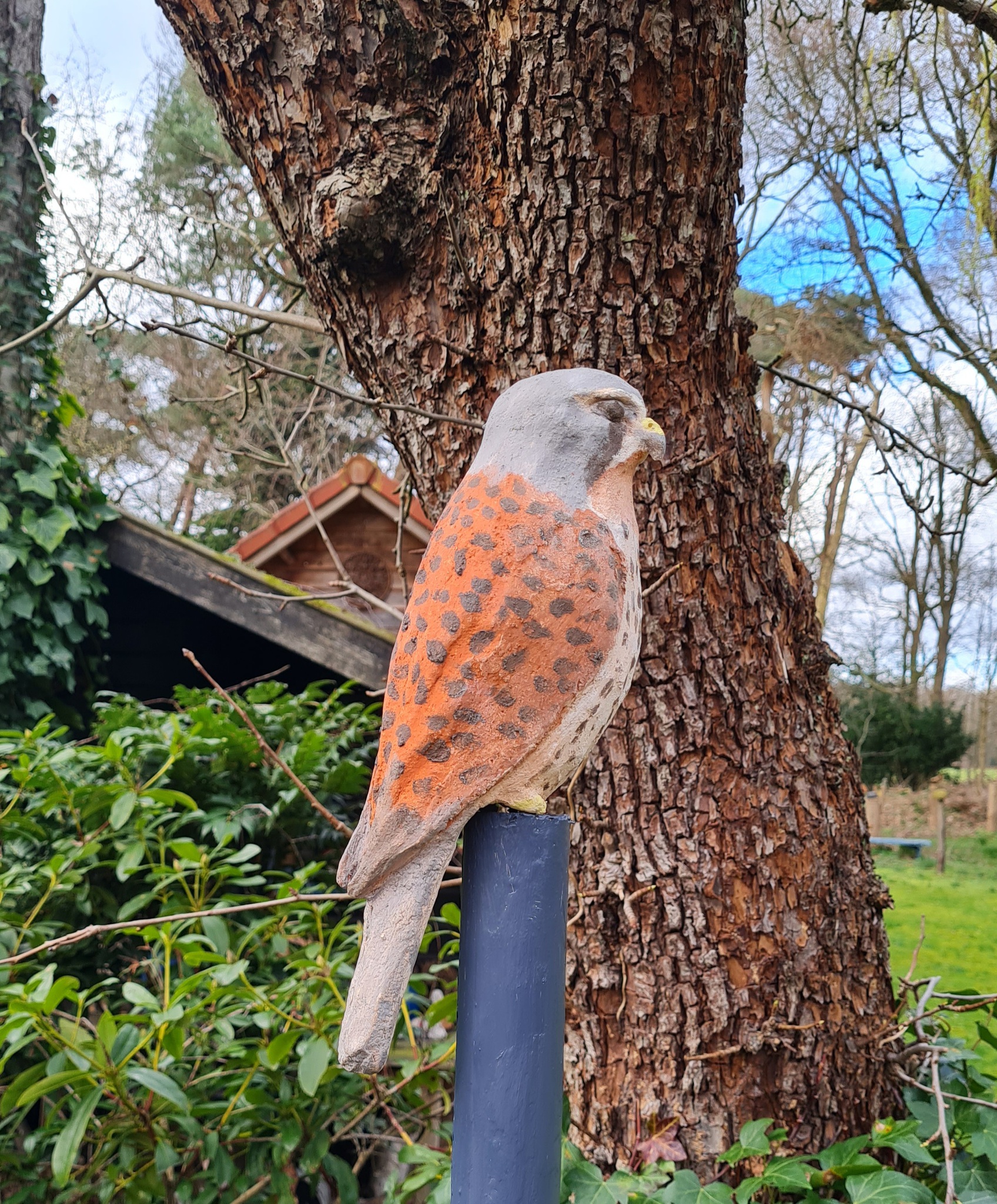 Interessante en vrome vogel. Klei met engobes. Kan 's winters buiten.