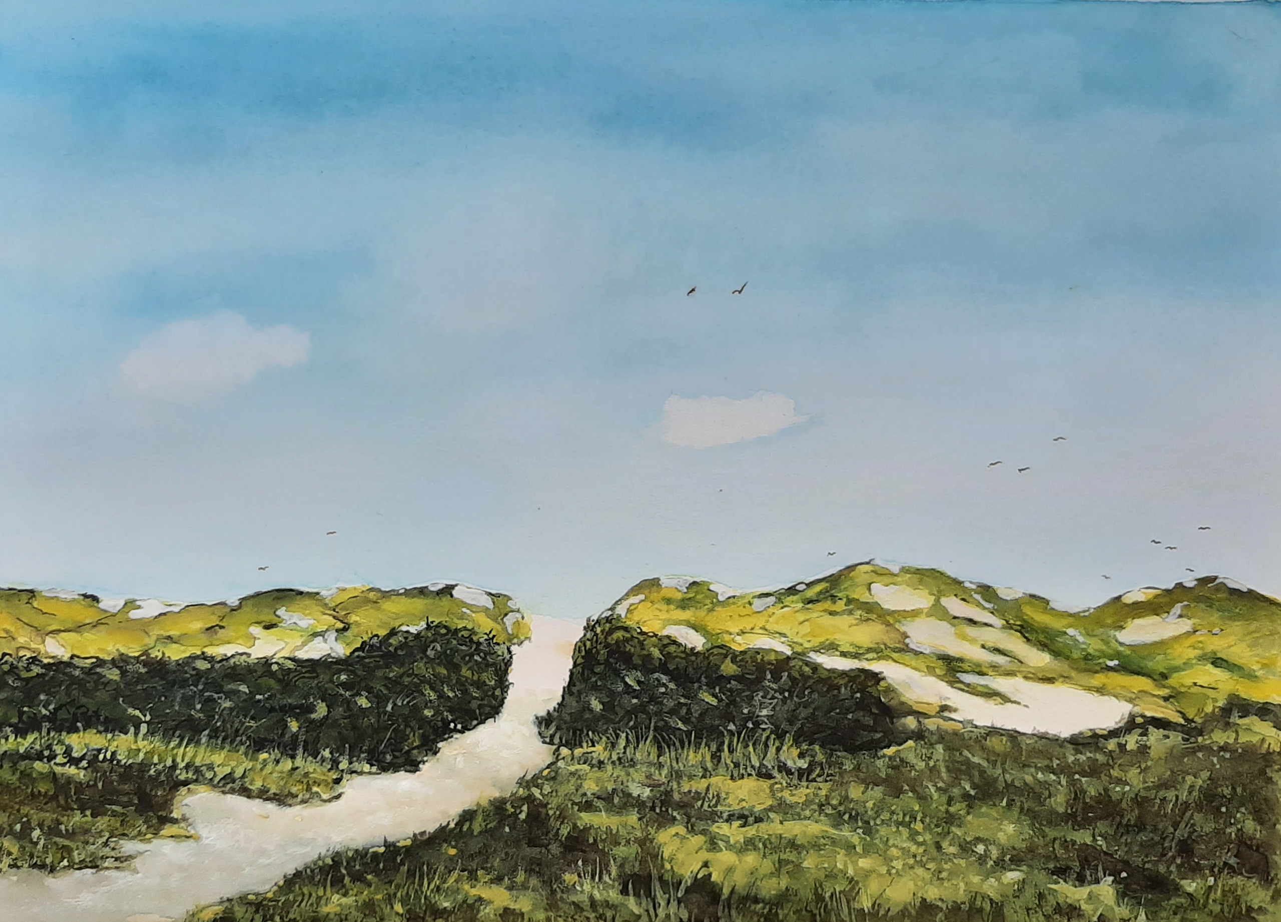 Voor het eerst naar Ameland in 2021. We logeerden en fietsten er een aantal dagen rond. De weersomstandigheden waren fantastisch. En zeker op de fiets adem je dan dit droomeiland helemaal in. De witte stranden en duinen. De rust. Ik ben sowieso al gek op kusten, dus hier kom je helemaal aan je trekken. Thuisgekomen onmiddellijk het aquarelblok tevoorschijn gehaald. En mijn impressies vastgelegd. Een tweede vakantie op Ameland, maar dan thuis. Het Oerd is een omvangrijk natuurgebied aan de oostzijde van Ameland. Het is een oud en begroeid duinencomplex, waarvan de Oerdblinkert met +24 meter het hoogste duin van het eiland is. Het aquarel is gemaakt op 300grams Canson Montval papier, 24x32