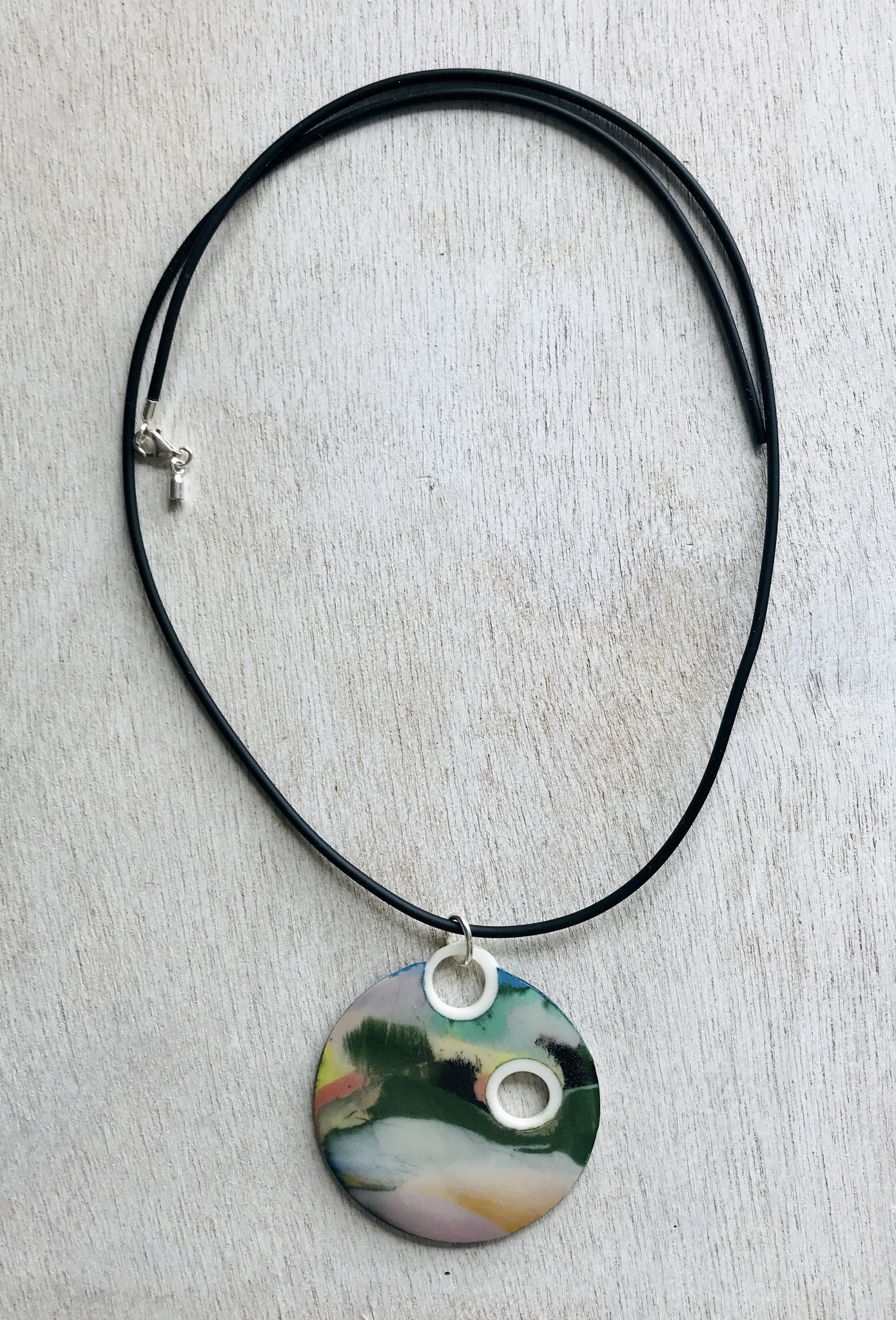 Prachtig 'landschapje' van porselein / gemaakt met stains en transparant glazuur / hangt aan zilveren ovale ring met daardoorheen een rubberen koord / het slotje en de eind-ogen zijn ook van zilver.