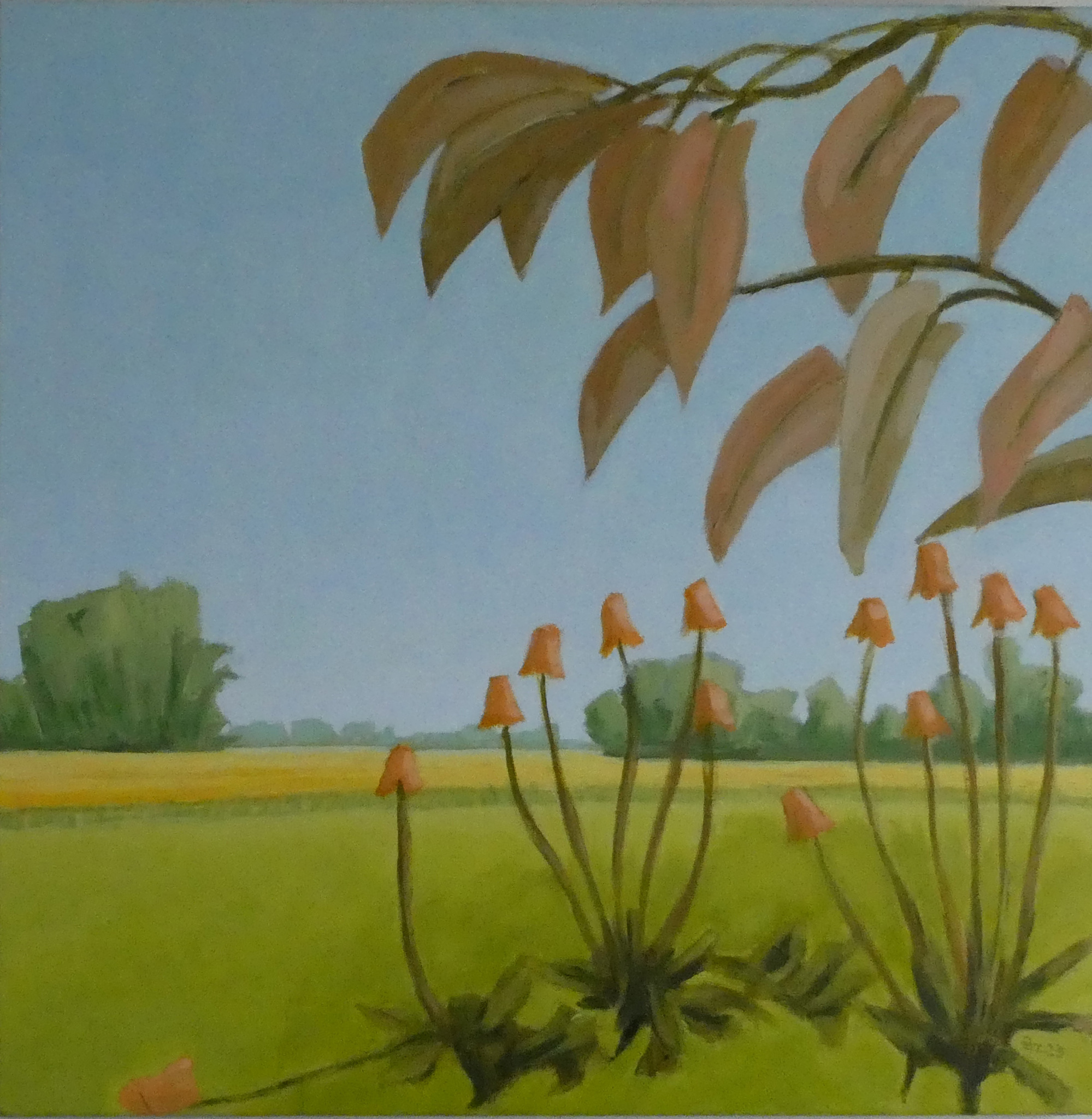 Zacht licht en zachte kleuren in de lente. Het veld met uitzicht op de verte. En op bomen die uitlopen. Dit schilderij wordt geleverd in een witte houten baklijst.