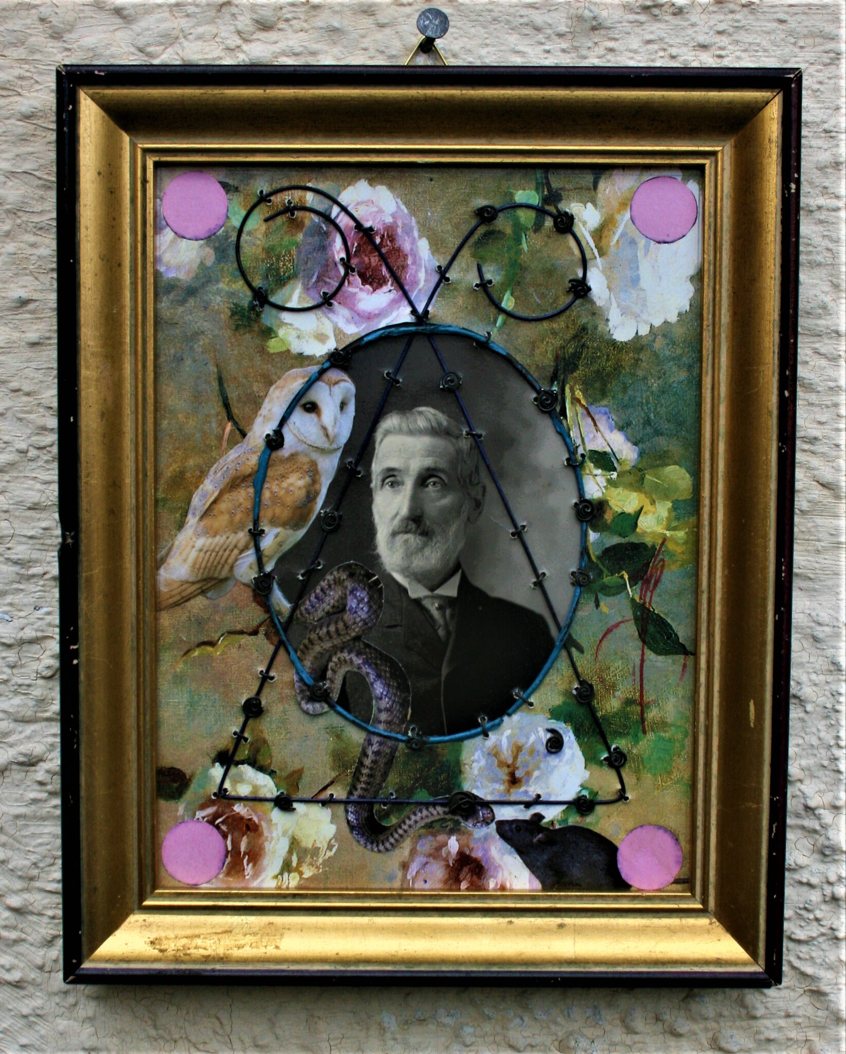 Antieke foto in originele lijst, bewerkt, ijzerdraad, acryl, collage