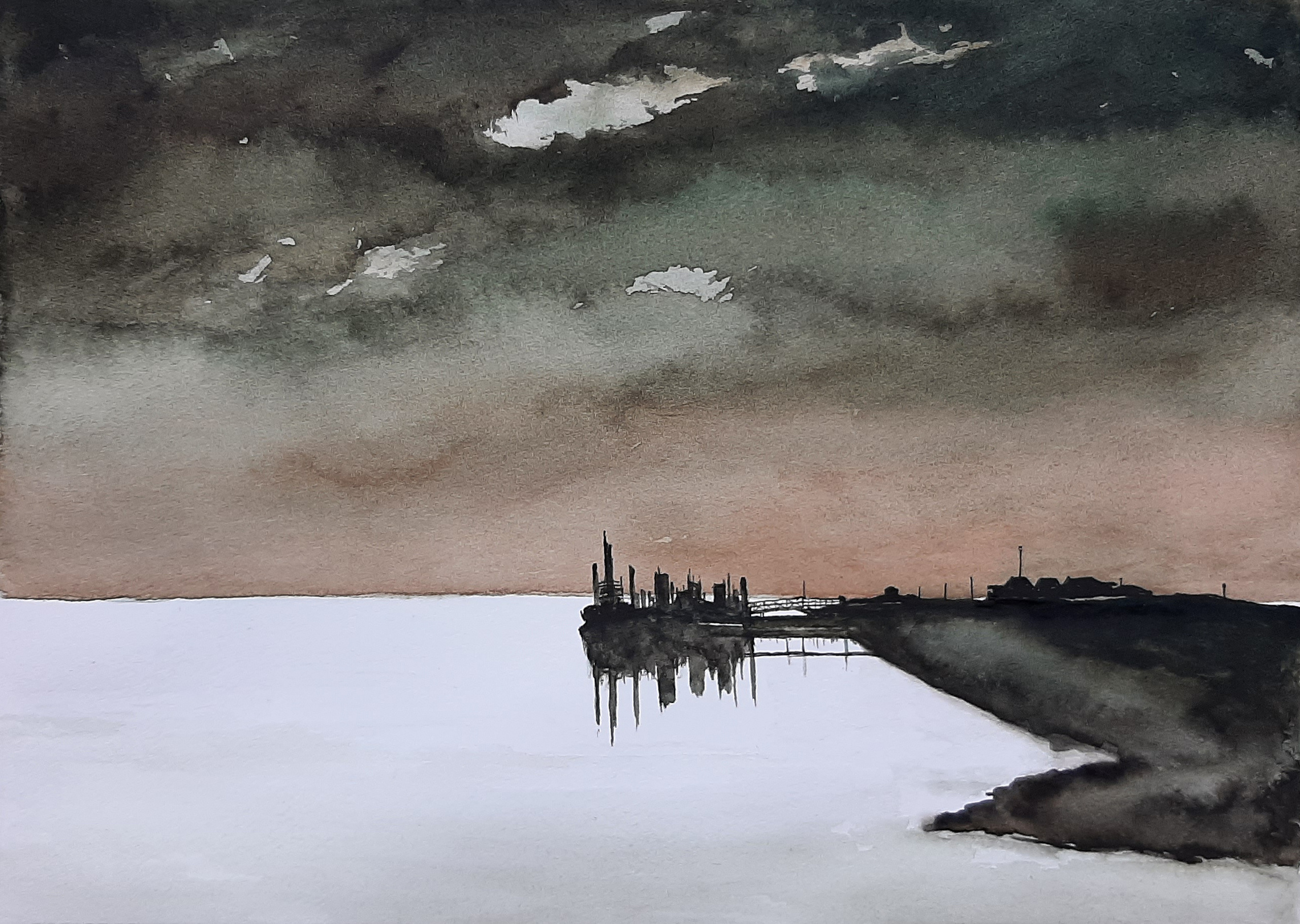 Voor het eerst naar Ameland in 2021. We logeerden en fietsten er een aantal dagen rond. De weersomstandigheden waren fantastisch. En zeker op de fiets adem je dan dit droomeiland helamaal in. De witte stranden en duinen. De rust. Ik ben sowieso al gek op kusten, dus hier kom je helemaal aan je trekken. Thuisgekomen onmiddellijk het aquarelblok tevoorschijn gehaald. En mijn impressies vastgelegd. Een tweede vakantie op Ameland, maar dan thuis. Maar in 2021 passeren we tijdens een van onze fietstochten de Ballumerbocht. Vanuit de verte oogt het mysteieus. Met de naam Ballumerbocht wordt ook wel het buitendijkse gebied op en nabij de Stroomleidam aangeduid. Op deze pier is eenreddingsstation van het eiland gevestigd, een van de twee reddingstations van de KNRM op Ameland. Op dezelfde pier zijn tevens verschillende oudere type reddingsboten van de KNRM te bezichtigen. Aquarel op 300 grams Canson Montval papier, 24x32