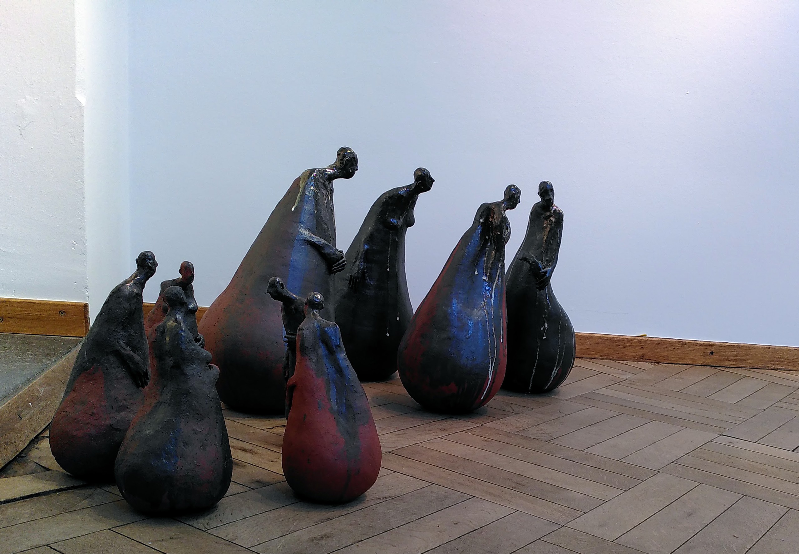 Bolvormige figuren, man, vrouw, keuvelend, opgebouwd in rood-bakkende klei en dan bewerkt met oxides en een witte glazuur. Deze beelden zijn hoog gebakken (1230°) en kunnen dus gerust buiten staan.