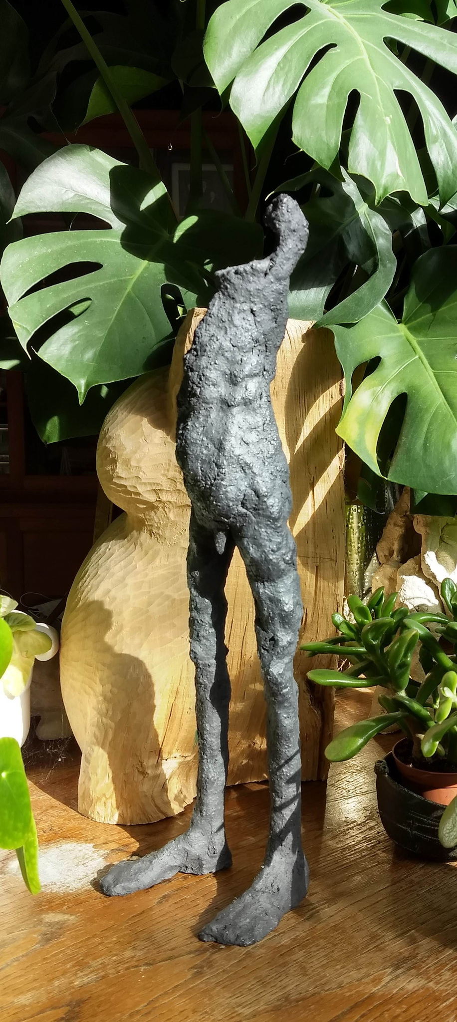 Sobere slanke figuren, opgebouwd met grove zwart-bakkende klei.
