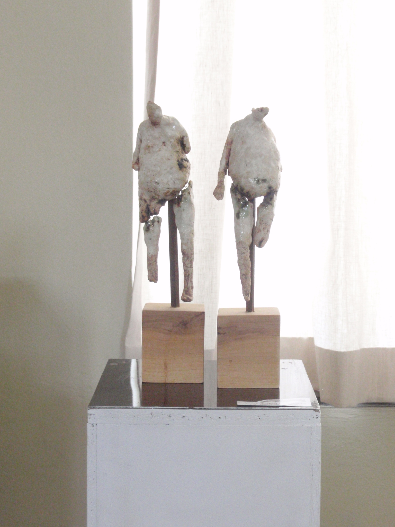 Opgebouwd met lappen klei waarbij ik wit-bakkende klei gebruik, deze even laat drogen en dan in de gewenste vorm plooi. De klei begint dan hier en daar mooi te barsten. Daarna worden de figuren met witte engobe bewerkt en na de eerste bak ingewassen met ijzer- en koperoxide. Dan volgt er nog een lik transparante glazuur.
