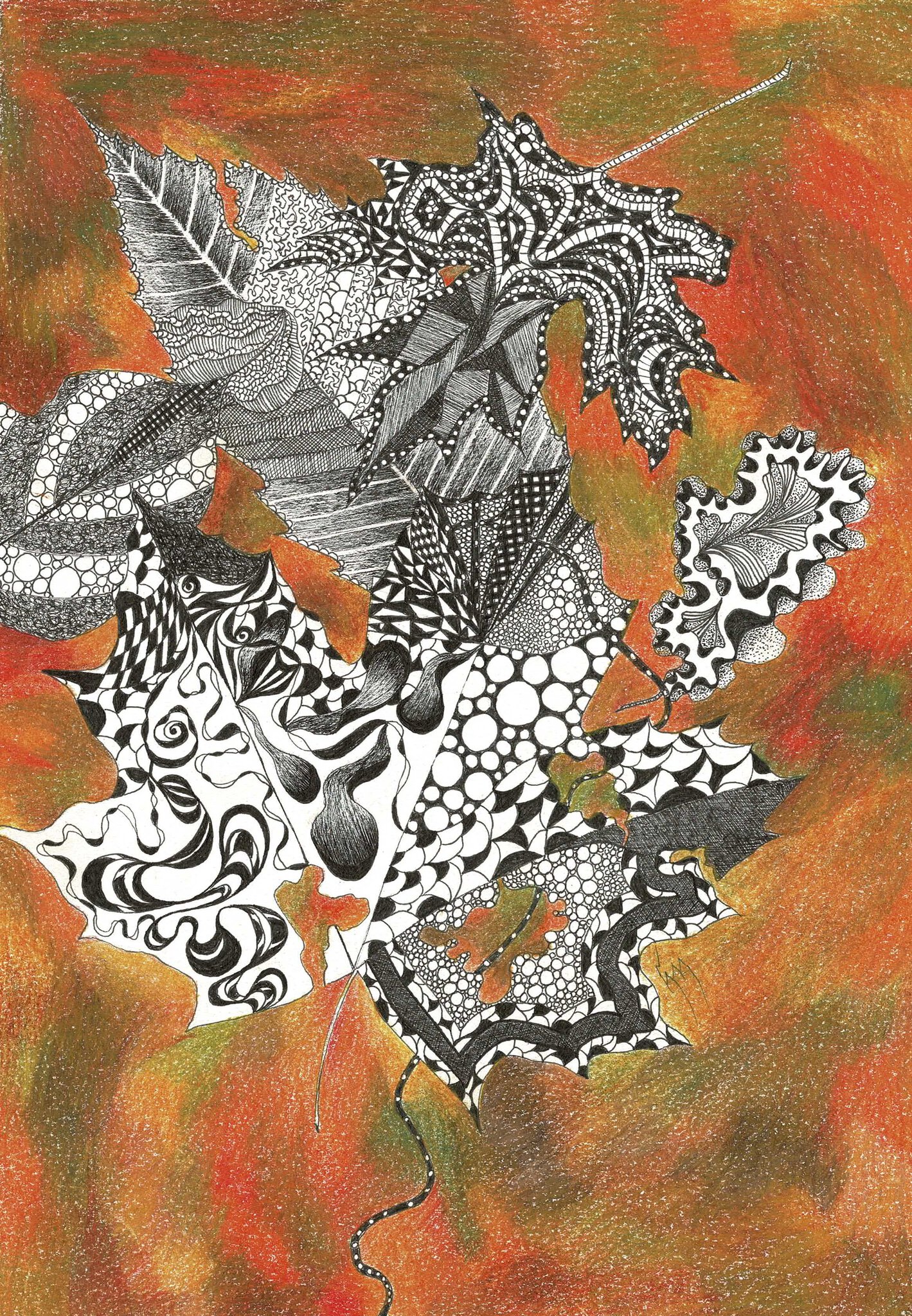 Herfstbladeren II, uitgewerkt met kleurpotlood