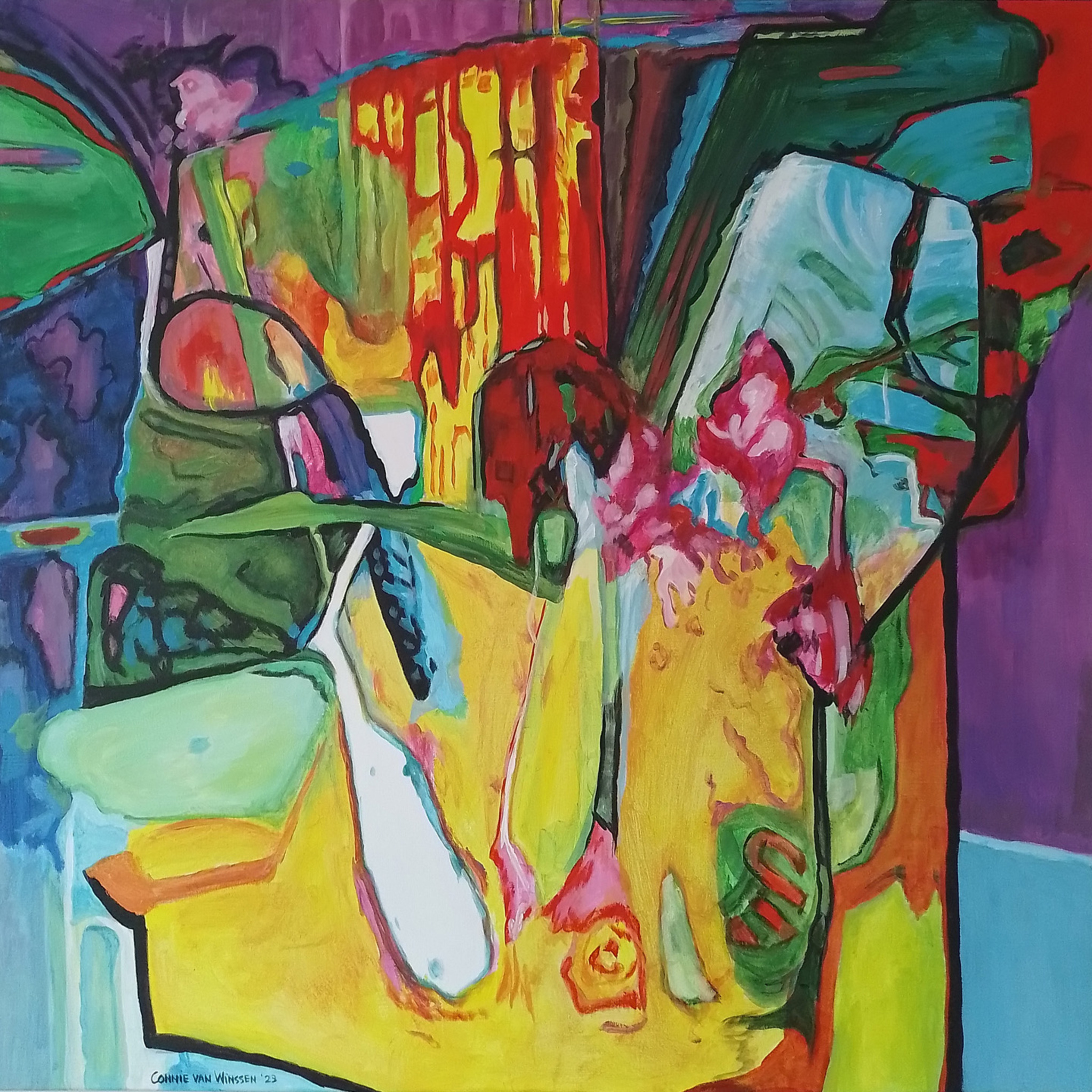 Connie maakt krachtige, kleurrijke schilderijen in acryl, zowel figuratief (mensen, dieren, landschappen en bloemen) als abstract