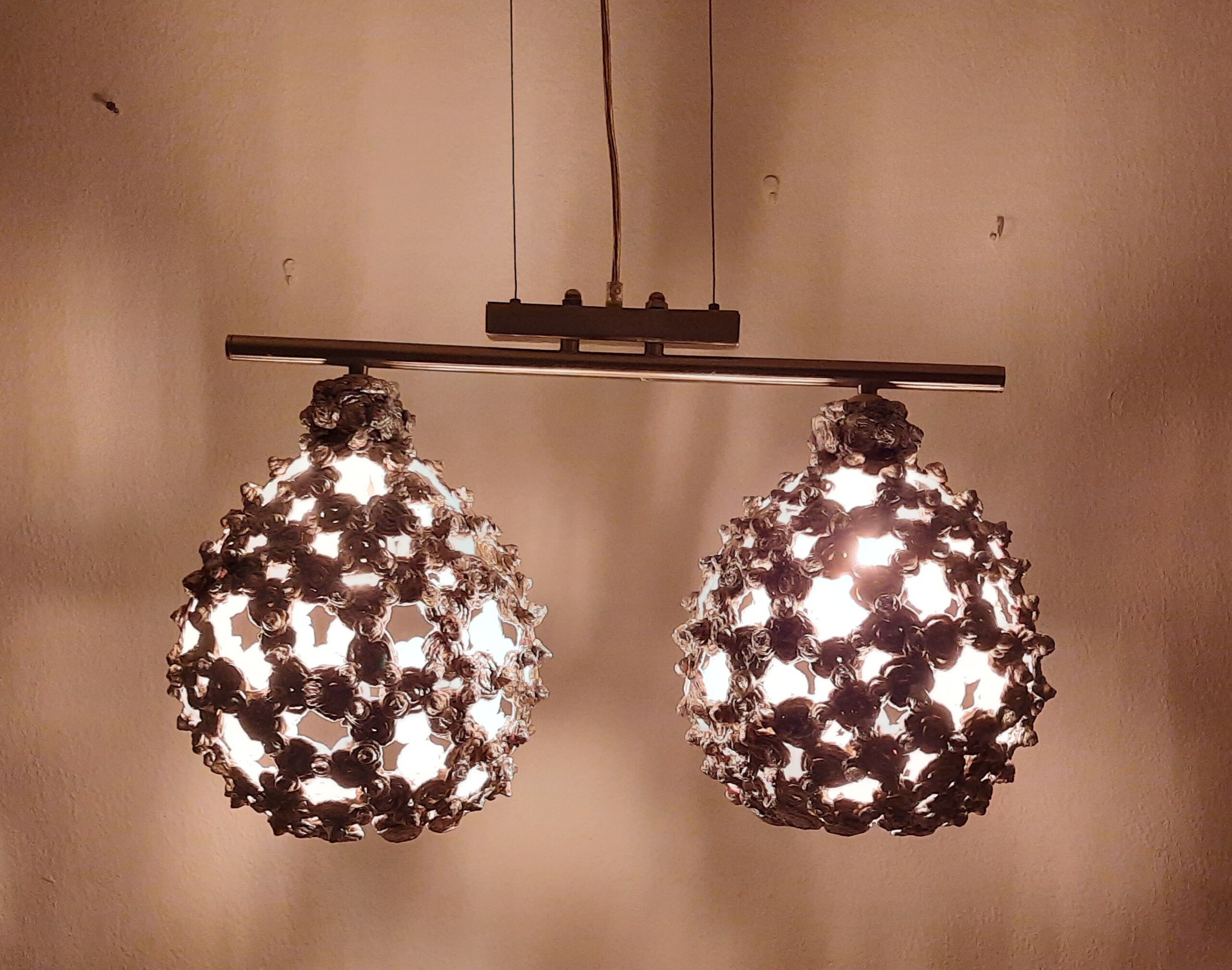 Door de zilveren verflaag zie je toch toch deze lampen van papier maché zijn gemaakt. Met LED lampen is het gebruik veilig. De afmetingen zijn in circa centimeters.
