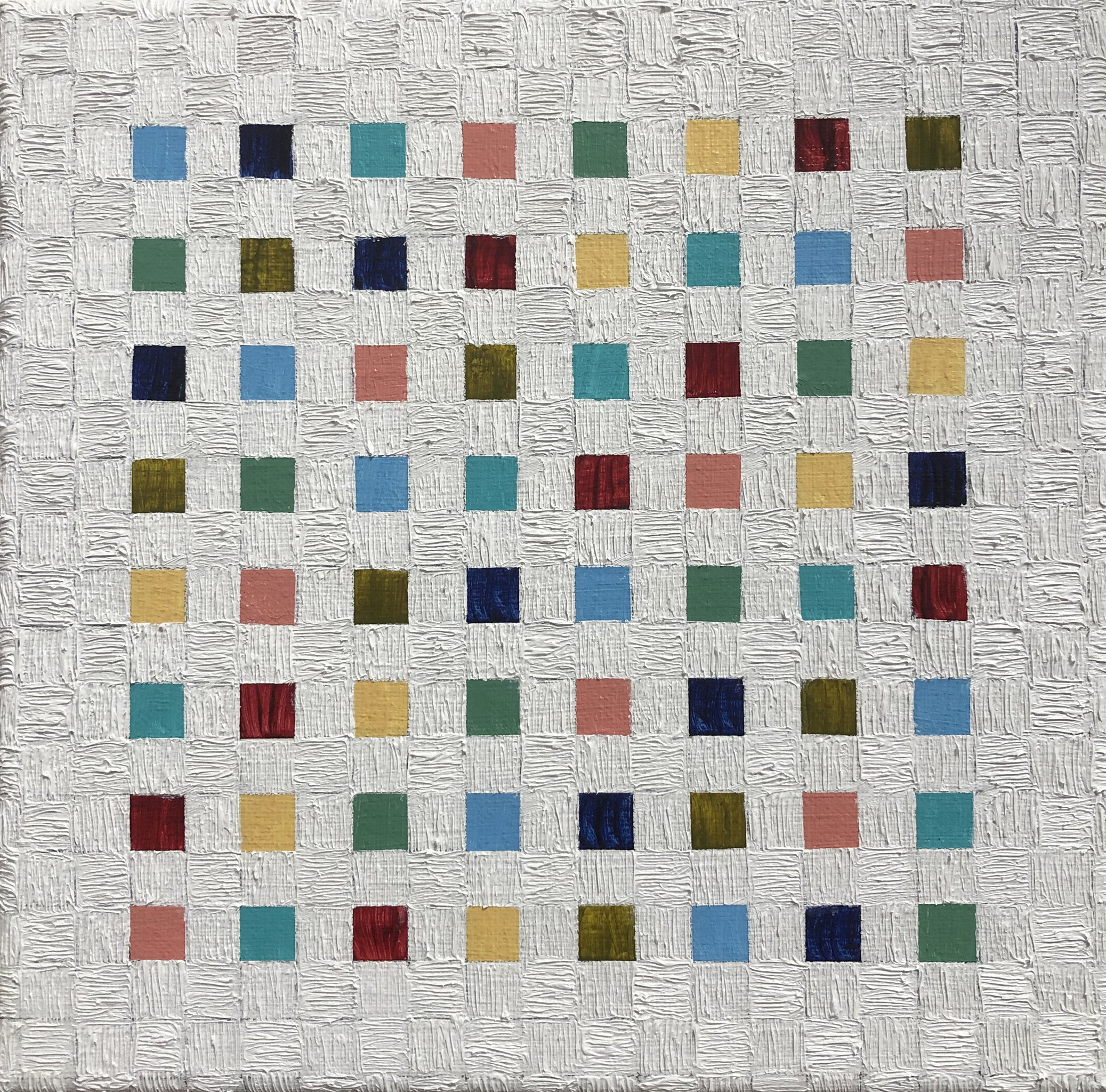 Thema: Chaos (Geometrische Chaos) Mijn kunst is beïnvloedt door de moderne wiskundige en wetenschappelijke benadering van het begrip complexe orde van de natuur. Met name heb ik me verdiept in de Chaos theorie en de fractal geometrie. Ik ben geen wiskundige, en ik gebruik geen wiskundige formules. De ideeën van de Chaos theorie en fractal geometrie leiden tot de ontwikkeling van de composities in mijn werk. Ik gebruik driehoeken,vierkanten en cirkels in mijn schilderijen, maar in mijn huidige serie, geoChao richt ik me alleen op de vierkanten en de verhoudingen tussen de vierkanten. Ik ontwikkel mijn composities door kleine vierkantjes op grote te zetten of grote op kleine te zetten. Het gaat om de onderlinge verhoudingen tussen de vierkanten. Ik laat de methode die ik kies de compositi