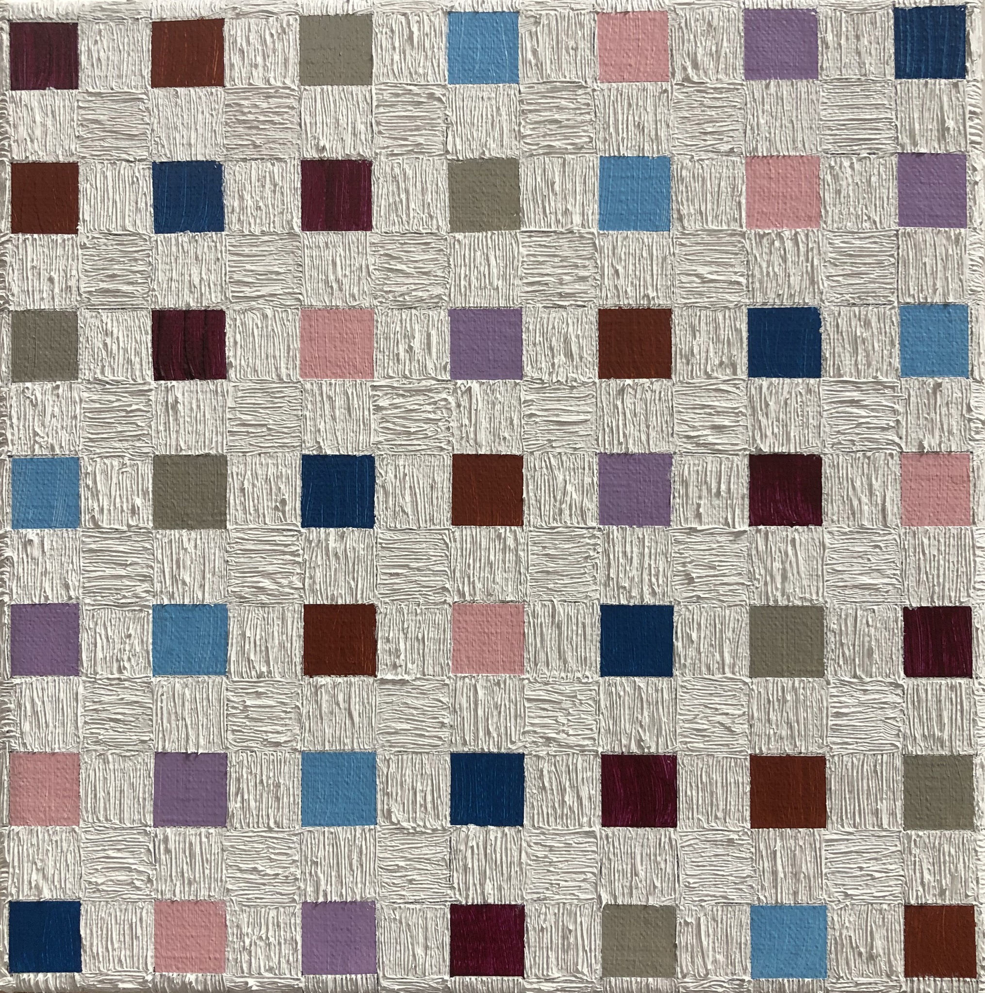Thema: Chaos (Geometrische Chaos) Mijn kunst is beïnvloedt door de moderne wiskundige en wetenschappelijke benadering van het begrip complexe orde van de natuur. Met name heb ik me verdiept in de Chaos theorie en de fractal geometrie. Ik ben geen wiskundige, en ik gebruik geen wiskundige formules. De ideeën van de Chaos theorie en fractal geometrie leiden tot de ontwikkeling van de composities in mijn werk. Ik gebruik driehoeken,vierkanten en cirkels in mijn schilderijen, maar in mijn huidige serie, geoChao richt ik me alleen op de vierkanten en de verhoudingen tussen de vierkanten. Ik ontwikkel mijn composities door kleine vierkantjes op grote te zetten of grote op kleine te zetten. Het gaat om de onderlinge verhoudingen tussen de vierkanten. Ik laat de methode die ik kies de compositi