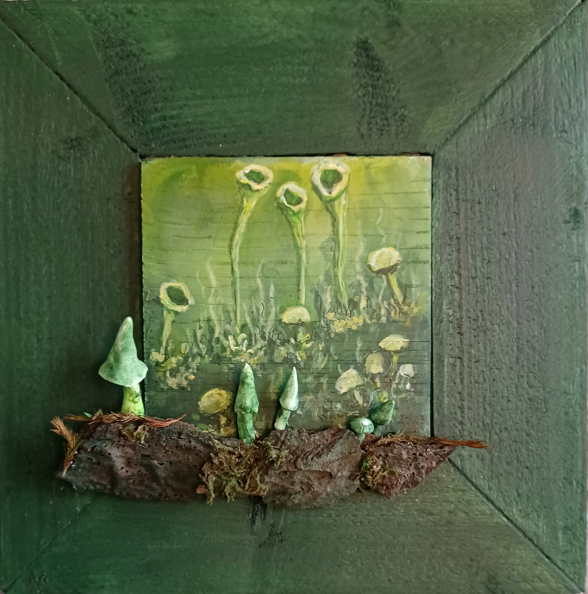 Een sfeervol 3D schilderij met groene paddenstoelen. Het is gemaakt met acrylverf op een houten paneel waar schors en paddenstoelen van klei aan toe zij gevoegd om een mooi driedimensionaal effect te creëren. Het geheel is in een groene houten lijst geplaatst, waardoor de paddenstoelen extra goed naar voren komen.