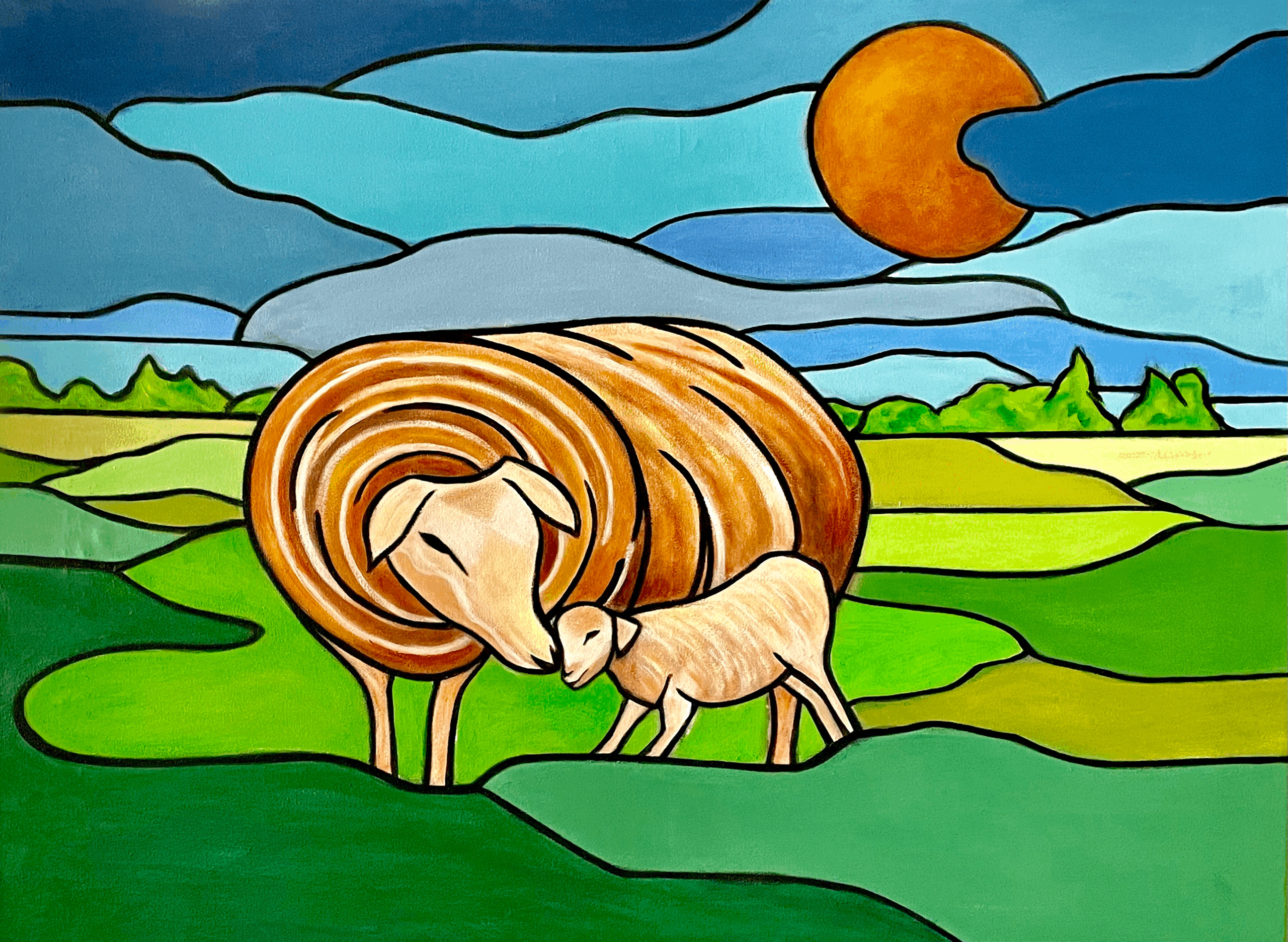 Lentelandschap met ooi en lam. In krachtige en kleurrijke glas-in-lood stijl.
